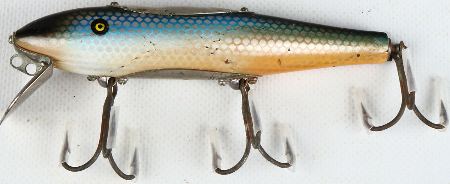 Pflueger Mustang, blue scale, PE, 3 hooks, marked lip, has both metal plates top & bottom, has two lie ties. Grade: Excellent - Value: 10 to 50