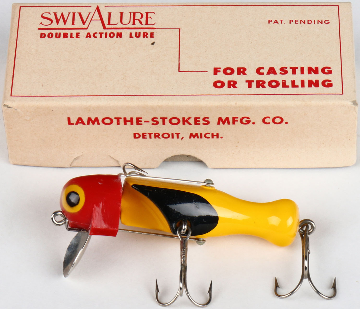 SwivAlure in the original box, double action, No. YB-20, yellow, black & red, PE, 3 hooks, head swings left to right as you retrieve it. Grade: MINT - Value: 10 to 60
