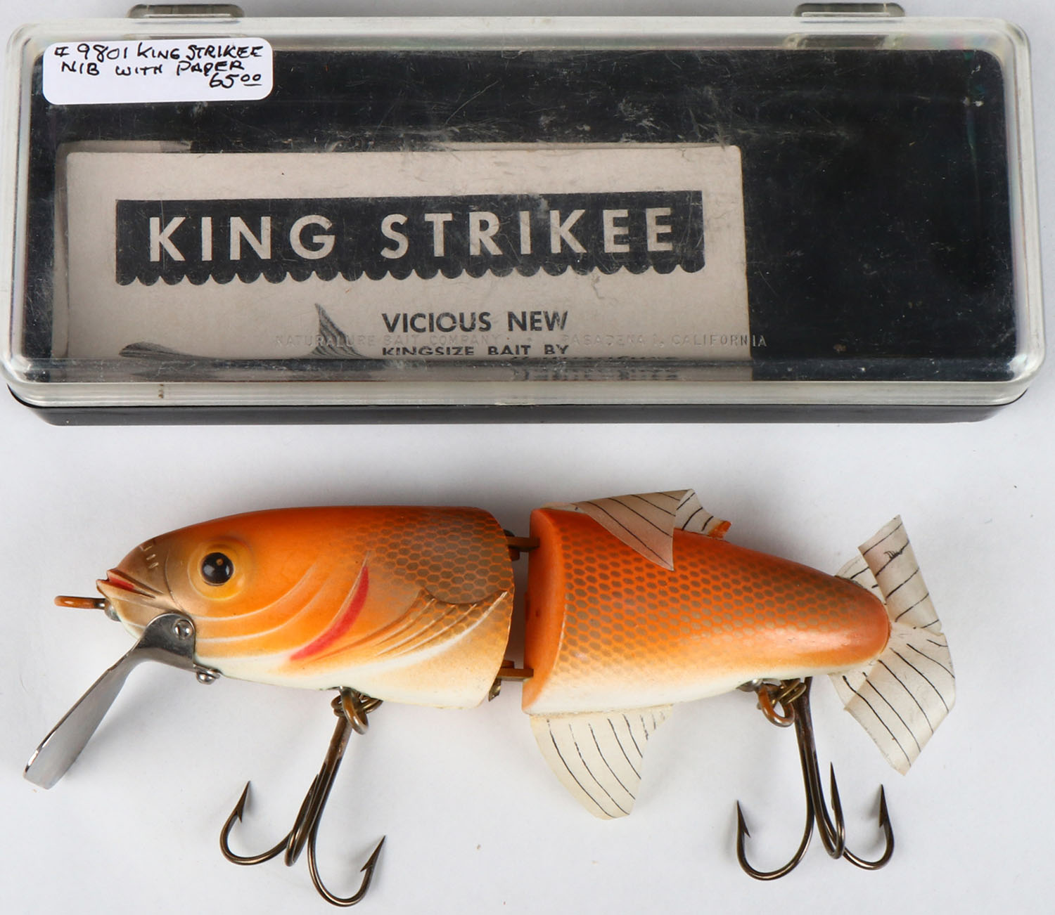 Natural lure bait co., Jointed King Size lure in the original box, orange scale, PE, metal lip, 2 hooks. Grade: Excellent - Value: 10 to 50