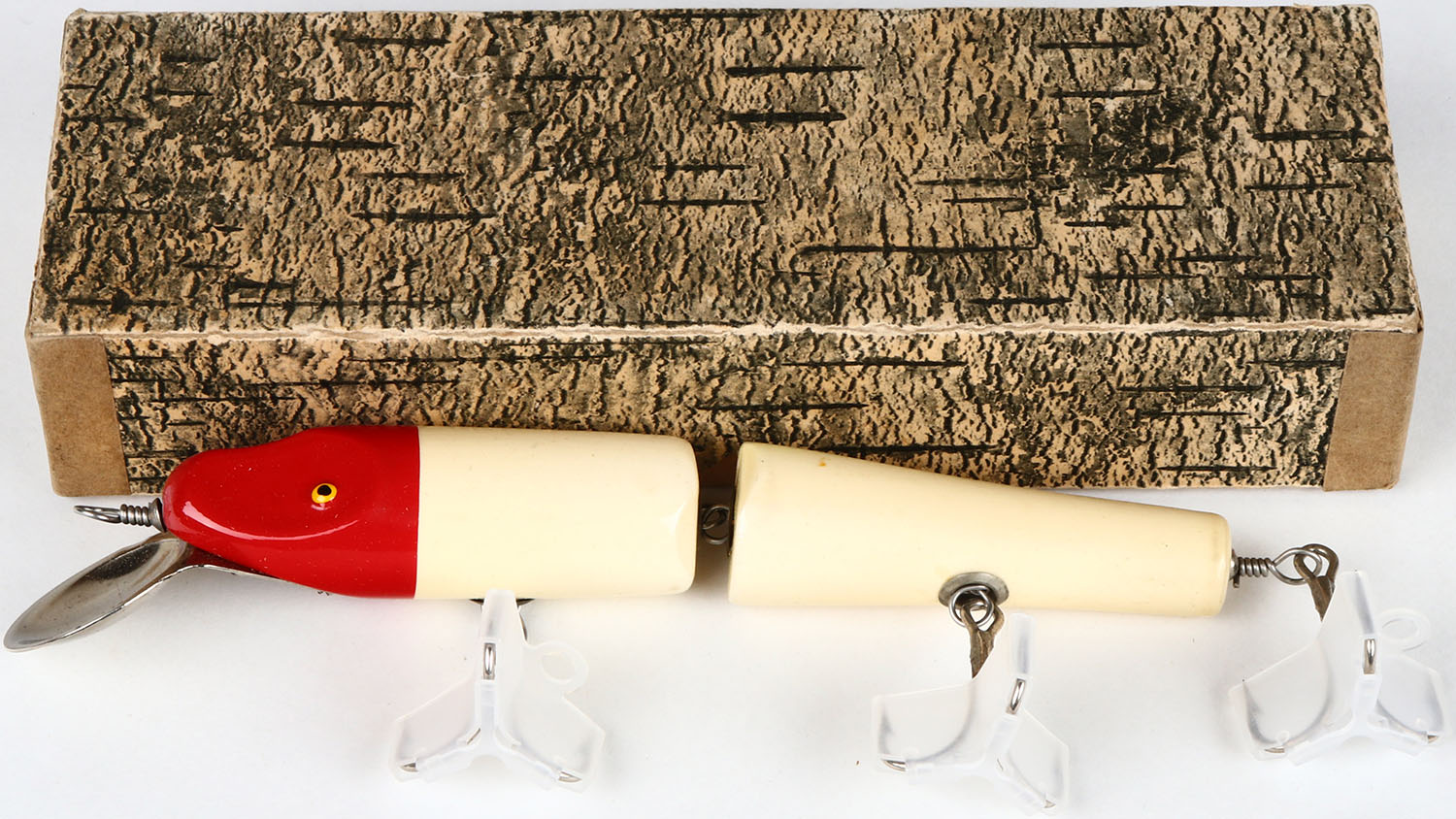 New S W Minnow in original box for Salmon, Musky or Big Bass, Jointed 6 lure, No 160, Red & white, TE, metal lip, 3 hooks. Grade; MINT - Value: 10 to 40