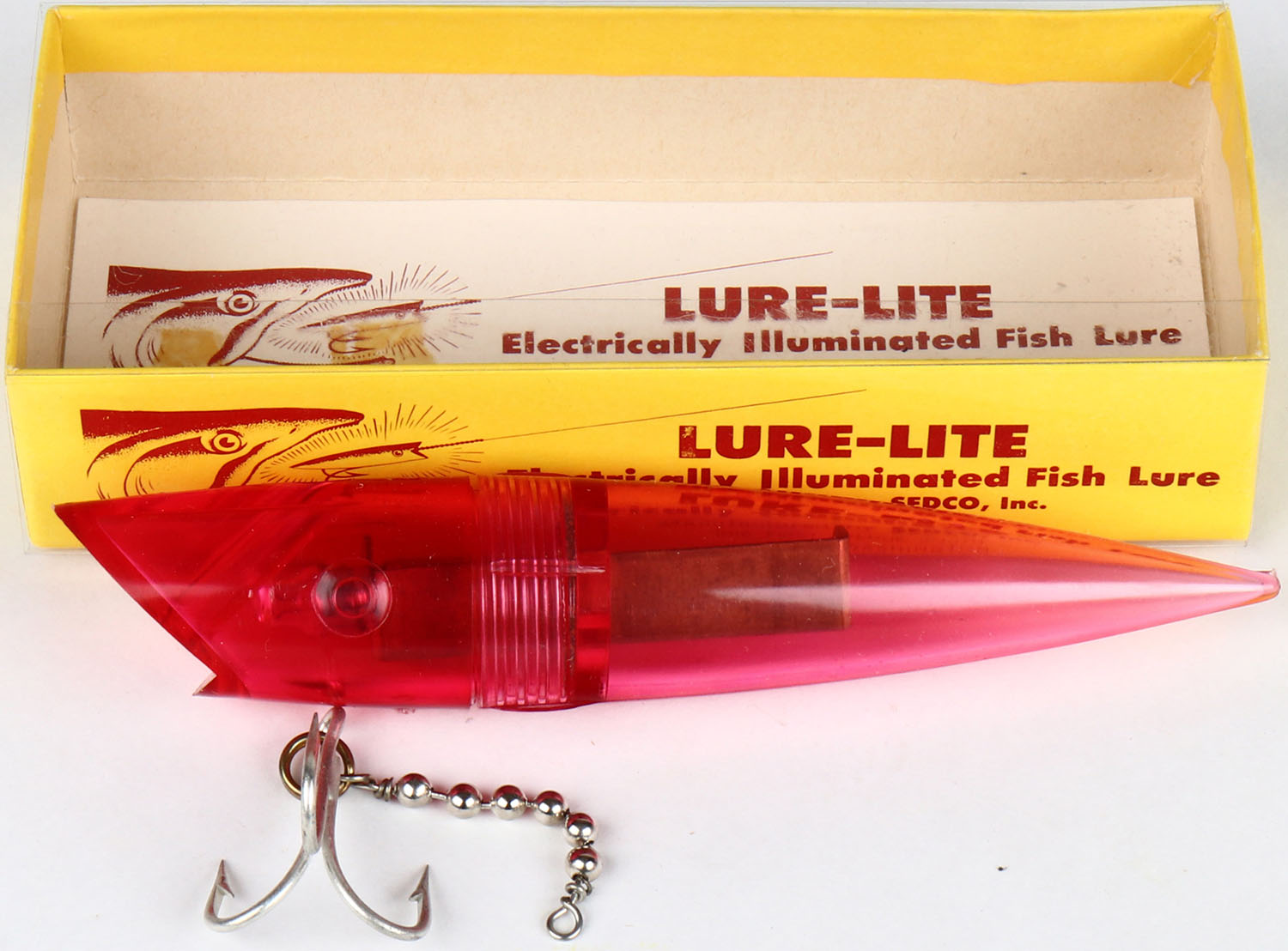 LURE-LITE, Seattle, Wash, Electrically Illuminated Fish Lure in original box, No. 6 red. Grade: Excellent ++ - Value: 20 to 60