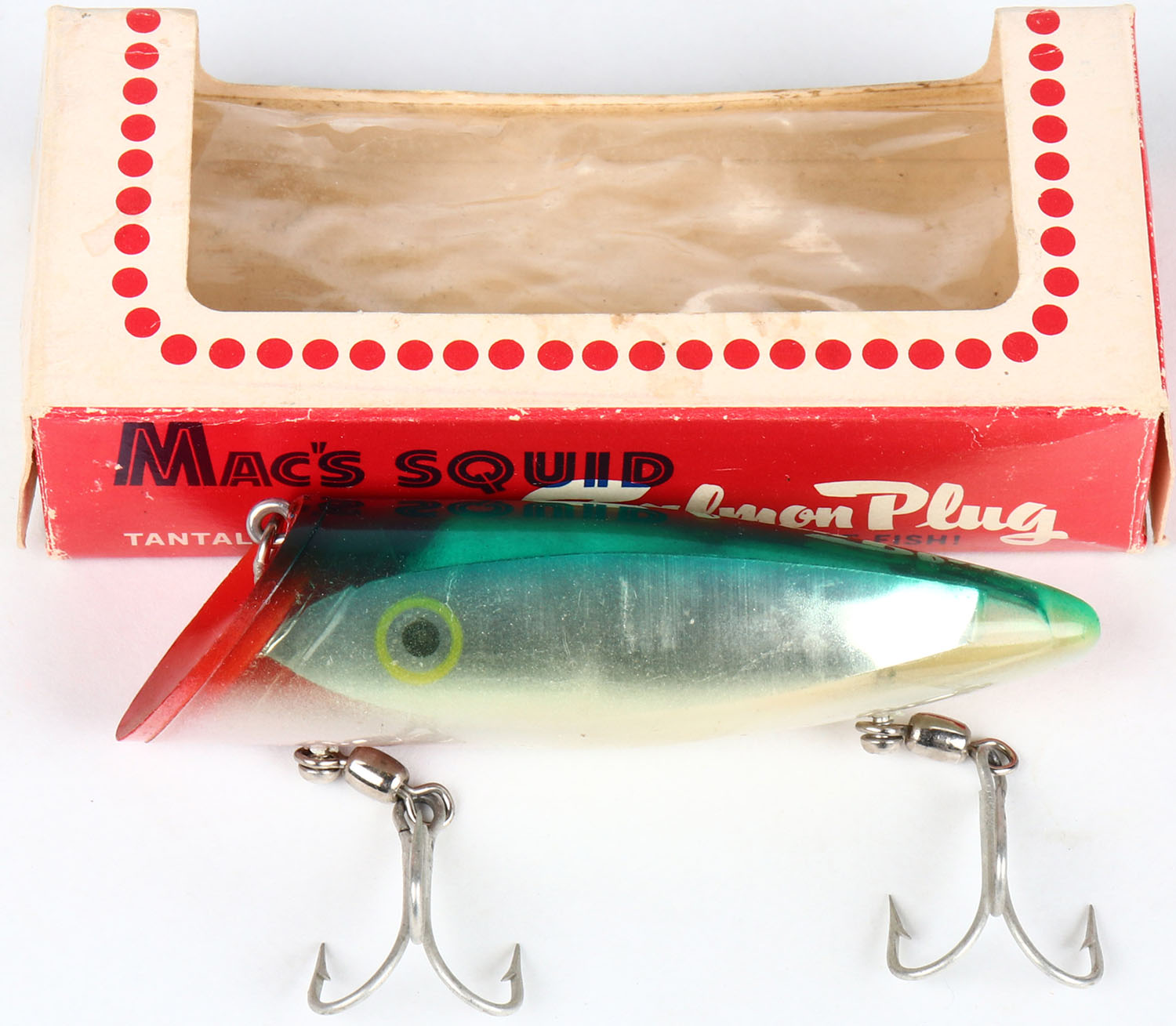 Macs Squid Salmon Plug in the original box, PE, well marked, green & silver. Grade: Excellent - Value: 10 to 40