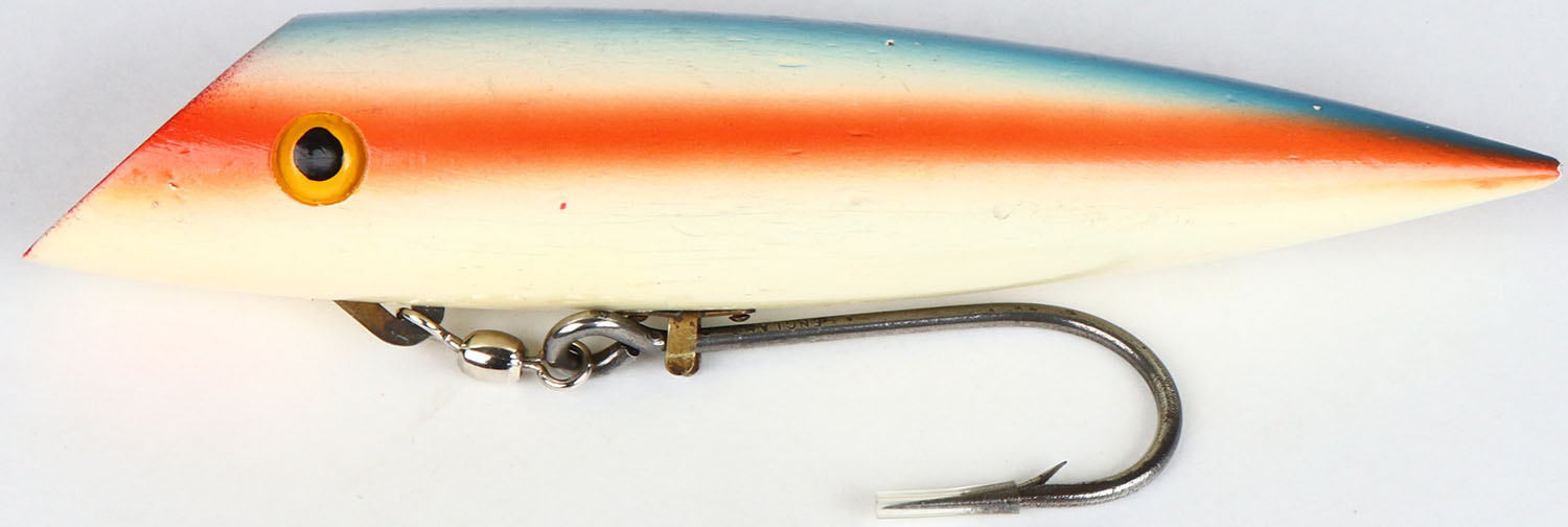 | L.E. Olsen Salmon Plug, CE, well marked, red, white & blue. Gra...