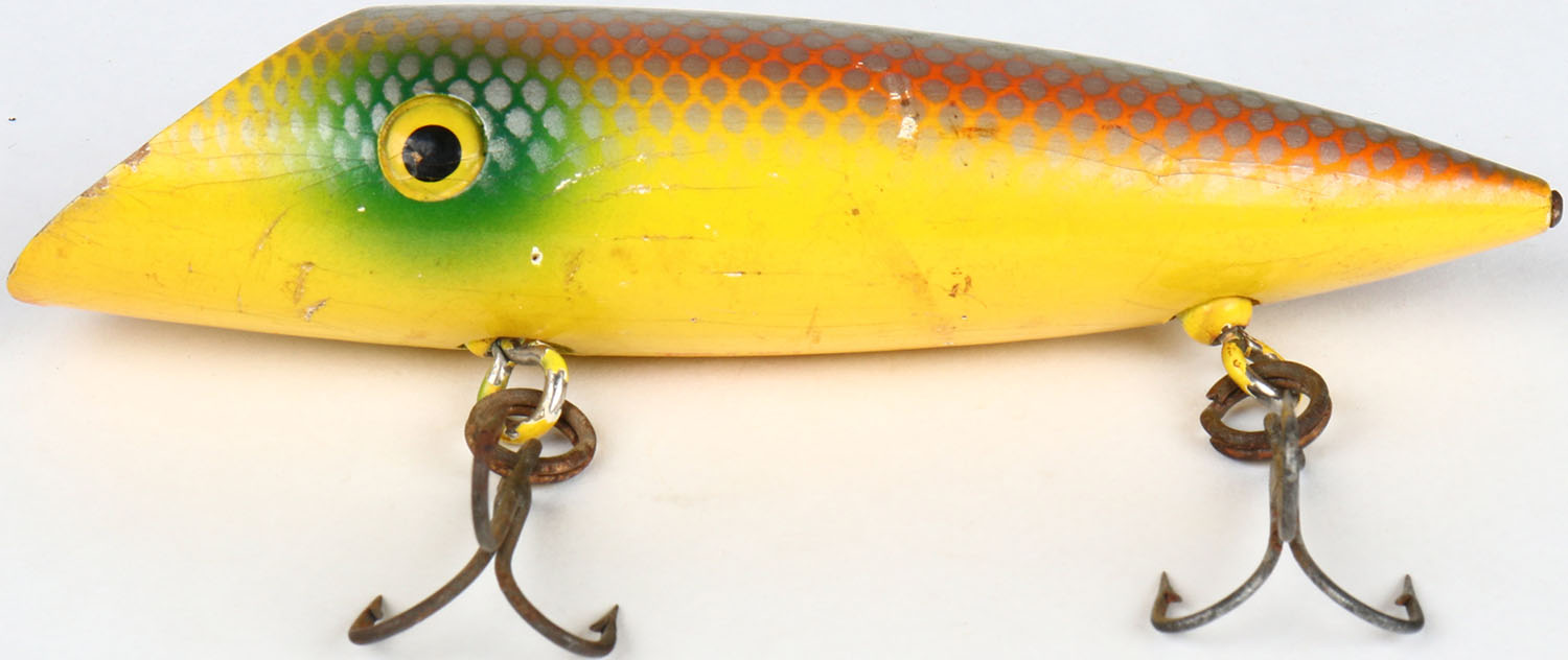 Arlington Salmon Plug, marked Arlington Pat. Pend, CE, well marked, green, yellow & orange scale. Grade: Excellent ++ - Value: 10 to 40