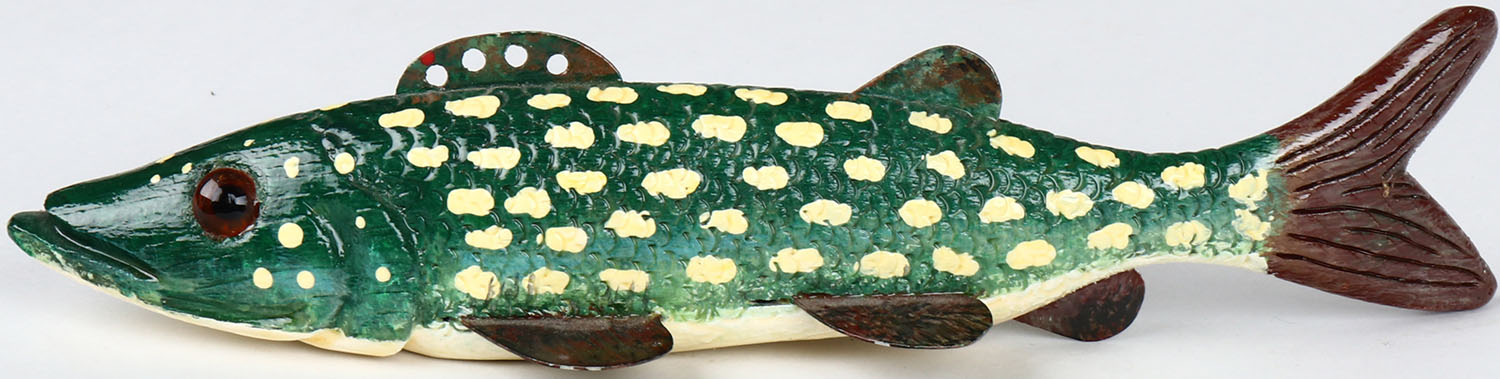 Bill Roberts Ice Fishing Decoy, GE, Pike, has 7 metal fins, 7'' OAL. Grade: Excellent - Value: 10 to 100