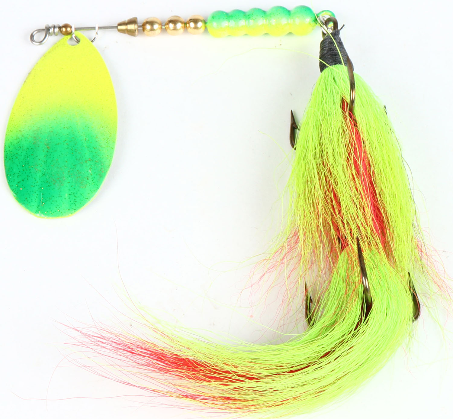 Unmarked large spinner with double green & red feather skirt, 8 OAL. Grade: Excellent ++ - Value: 2 to 30