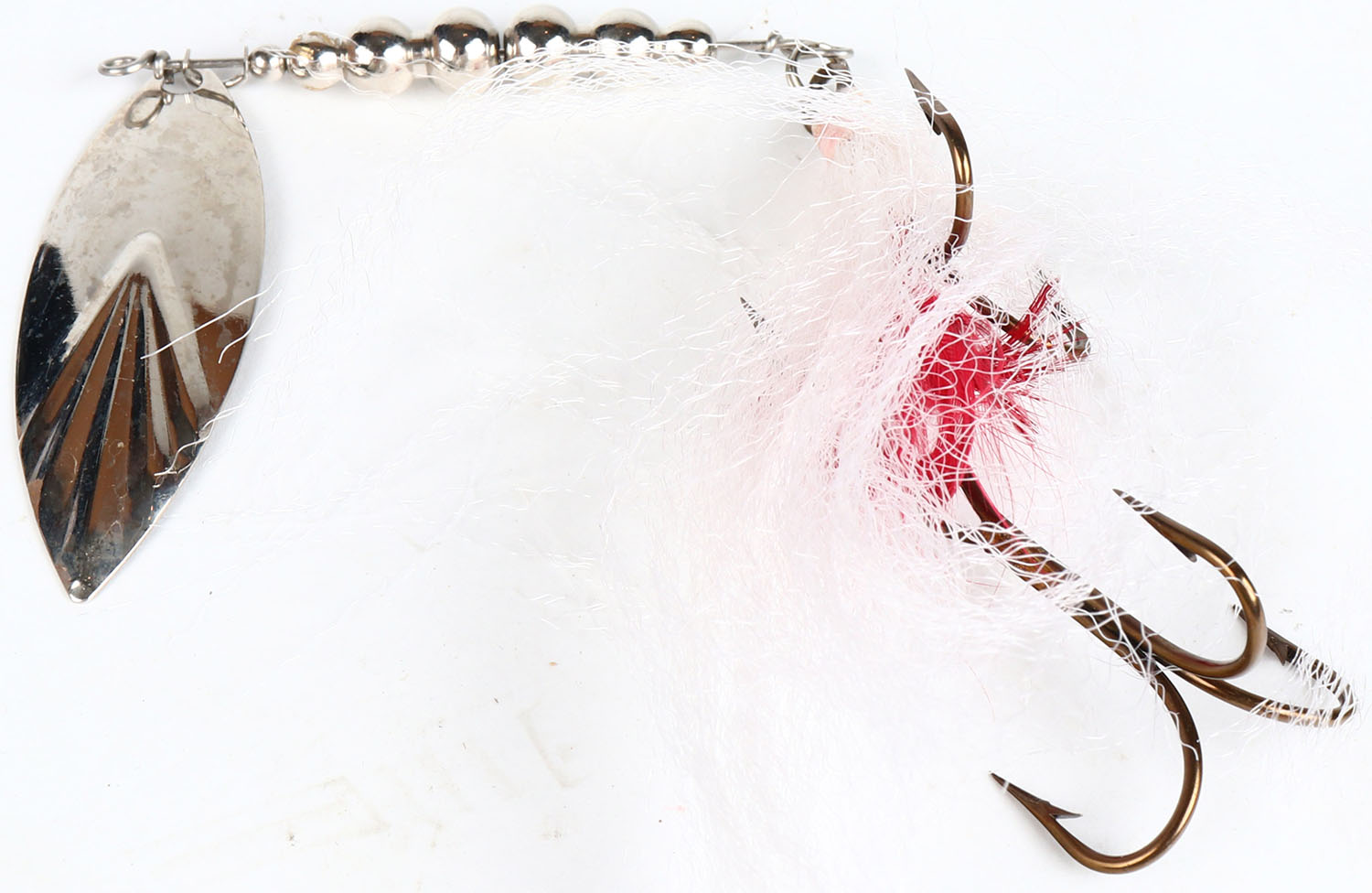 Unmarked large spinner with double white & red feather skirt, 8'' OAL. Grade: Excellent ++ - Value: 2 to 30