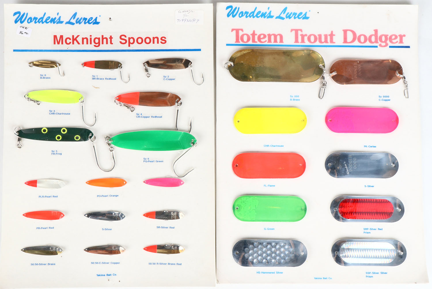Lot of 2 Full Cards by Wordens Lures, on for Totem Trout Dodger spoons & the other for McNight Spoons, shows color codes, 11'' x 15''. Grade: Excellent - Value: 10 to 60