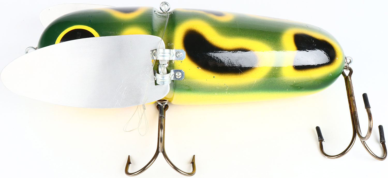 Large Display Fishing lure by Ken Pison?, signed on bottom, made to look like Heddon Crazy Crawler, 19'' x 6'' x 6'' body size, would look great in a display or collection. Grade: Excellent ++ - Value: 20 to 200