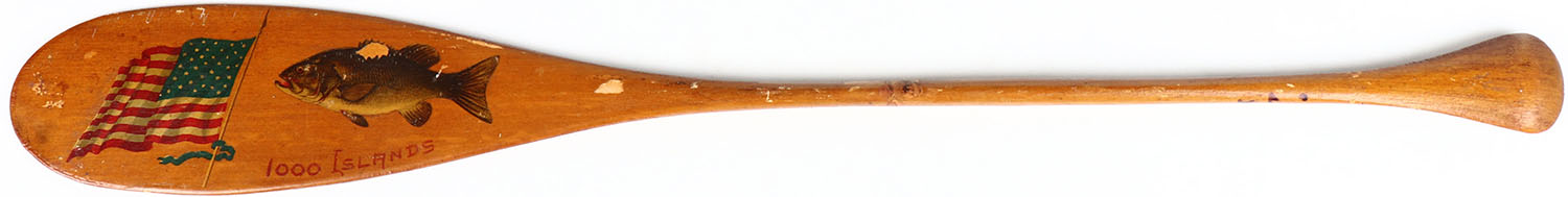 1940s Souvenir Paddle from 1000 Islands, pictures American flag & a large mouth bass, 22'' long. Grade: Very Good ++ - Value: 20 to 100