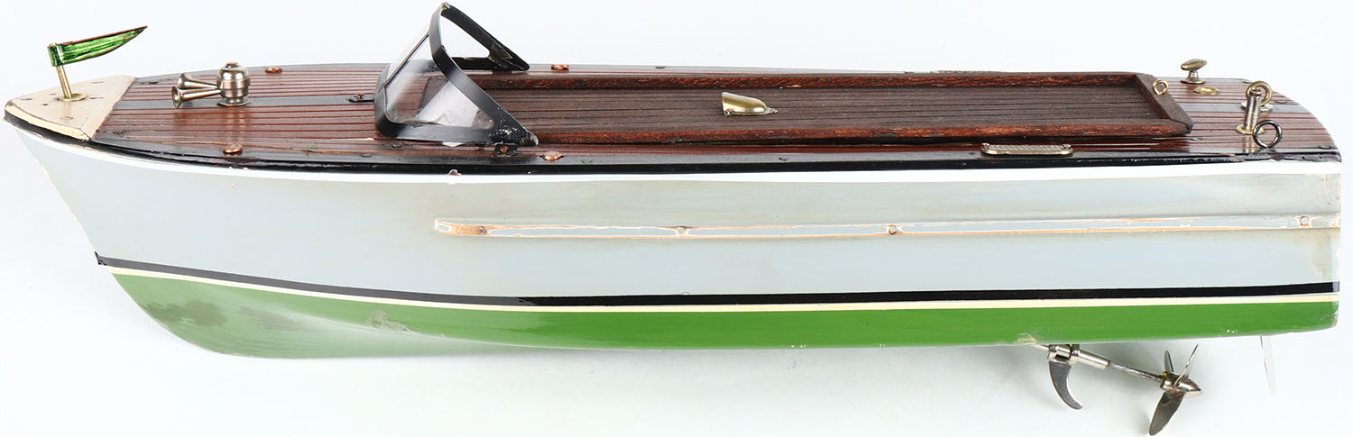 Power Electric Model Speed Boat, wooden boat has electric inboard motor & hand steering paddle, appears complete and in working order, boat & electrical look near mint. Grade: Excellent ++ - Value: 20 to 200