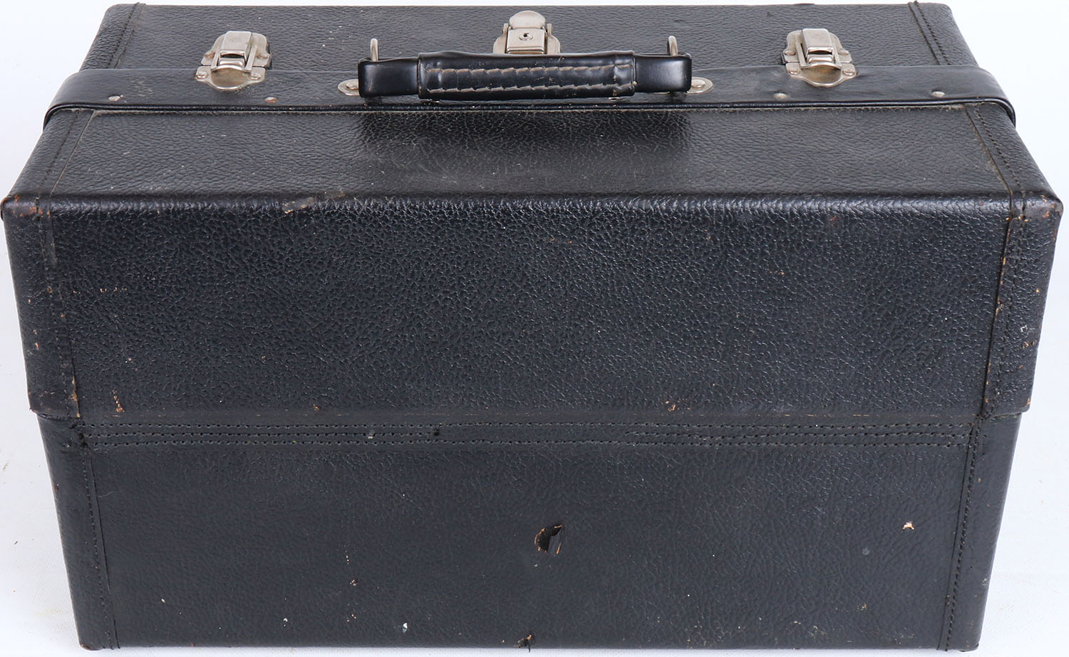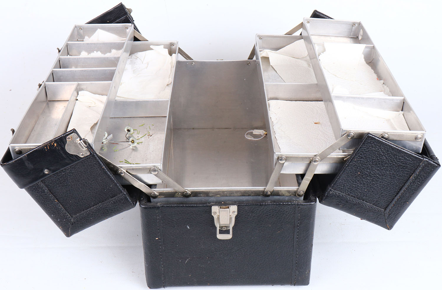 | Early Excelsior Leather fishing tackle box with aluminum fold ou...