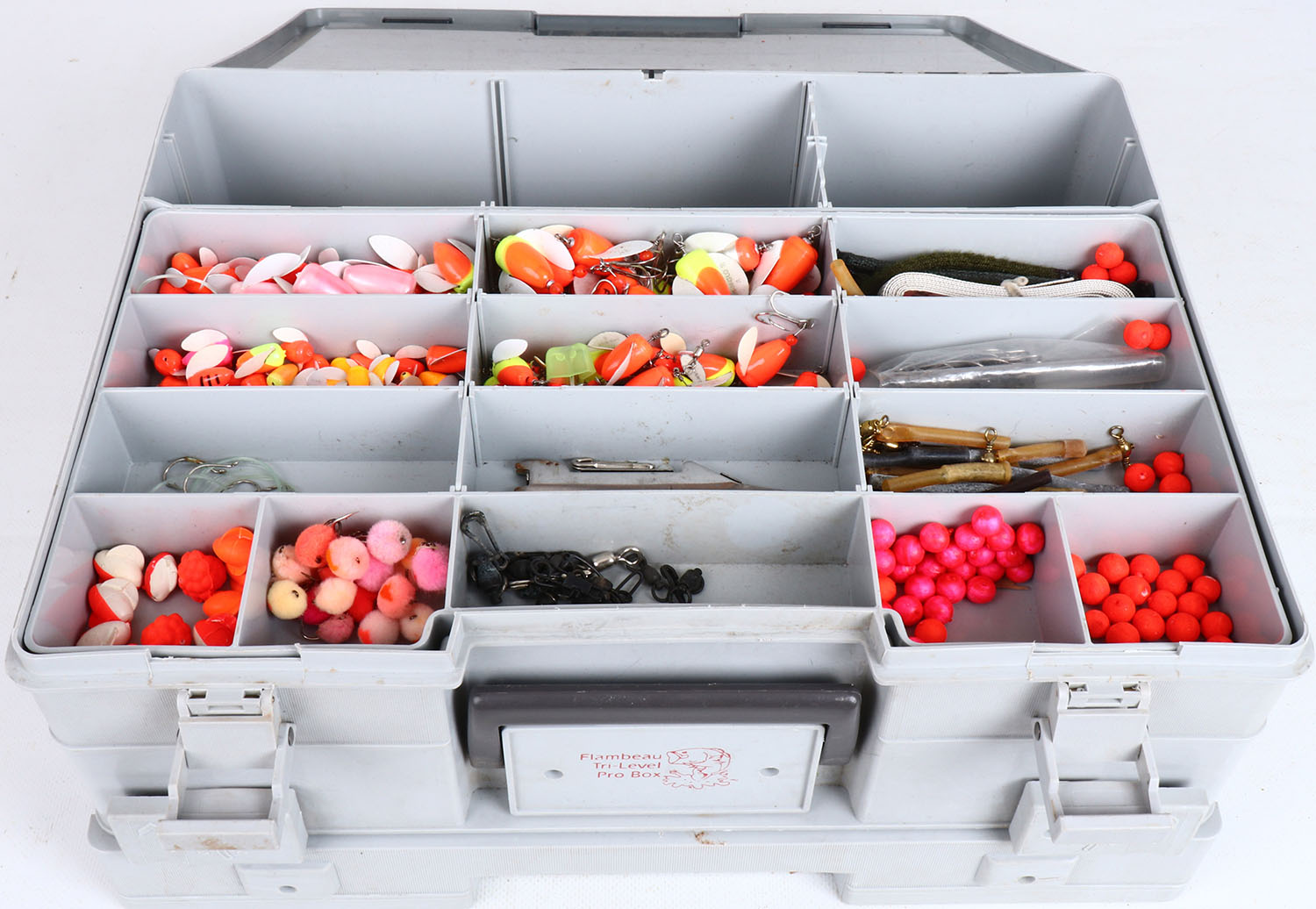 Steelhead/Salmon fishing tackle box by Flambeau, full of corkys, hotshots & other fishing gear, 15'' x 11'' x 7''. Grade: Excellent - Value: 10 to 80