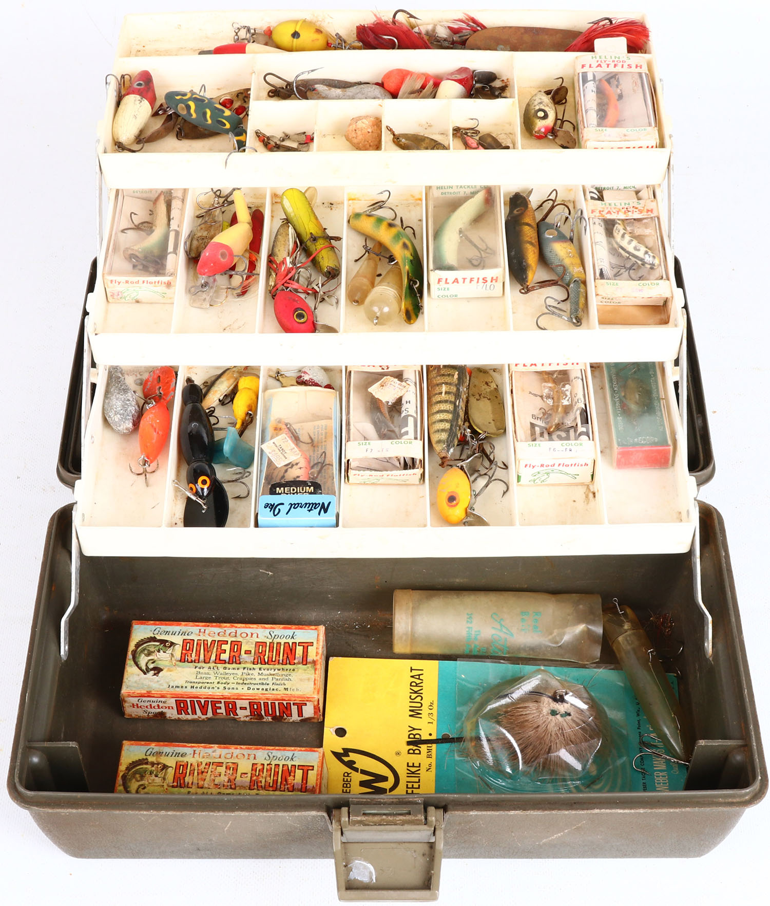| Tackle Box full of old lures like Heddon, many are wood, Advent...