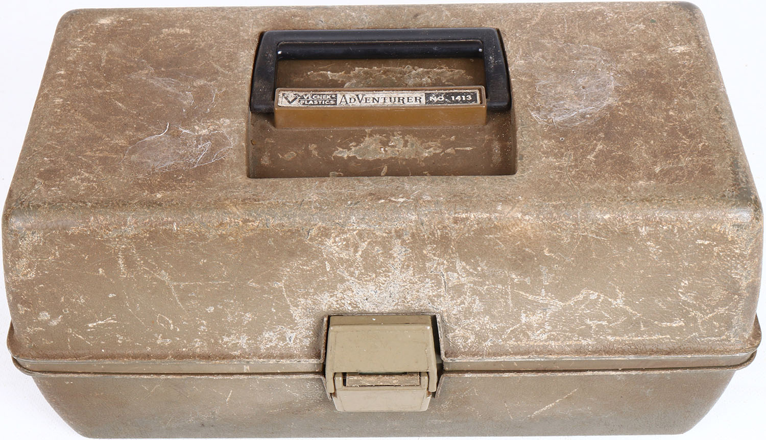 Tackle Box full of old lures like Heddon, many are wood, Adventures No. 1413 box. Grade: Very Good ++ - Value: 20 to 100
