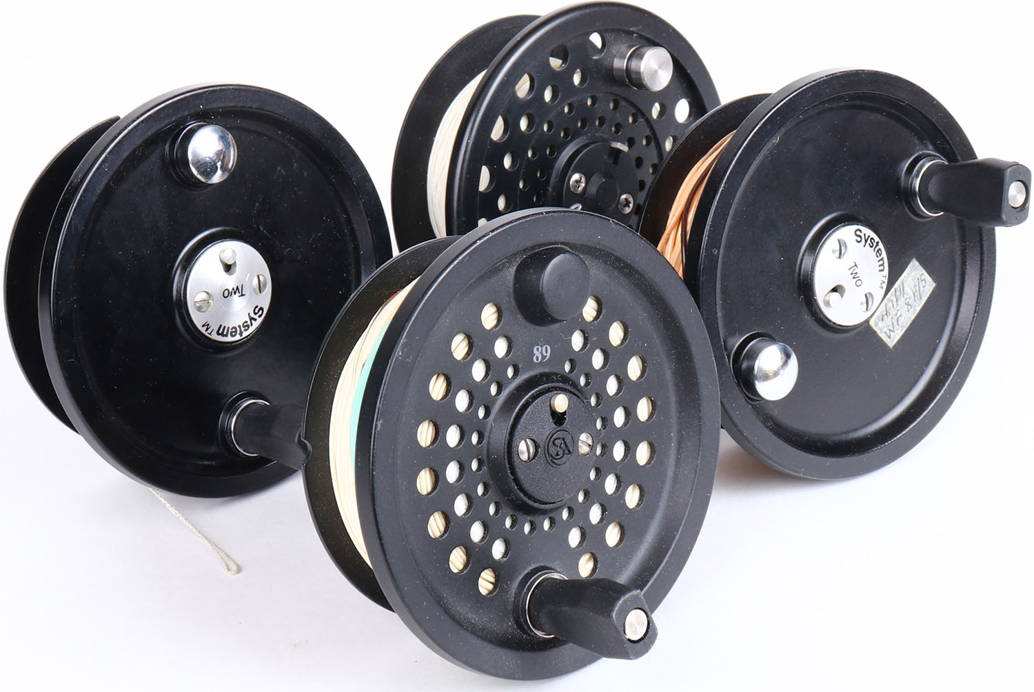 Lot of 4 Fly Reel Spools with line, marked Orvis, System Two System Two & VS 68. Grade: Excellent - Value: 10 to 50