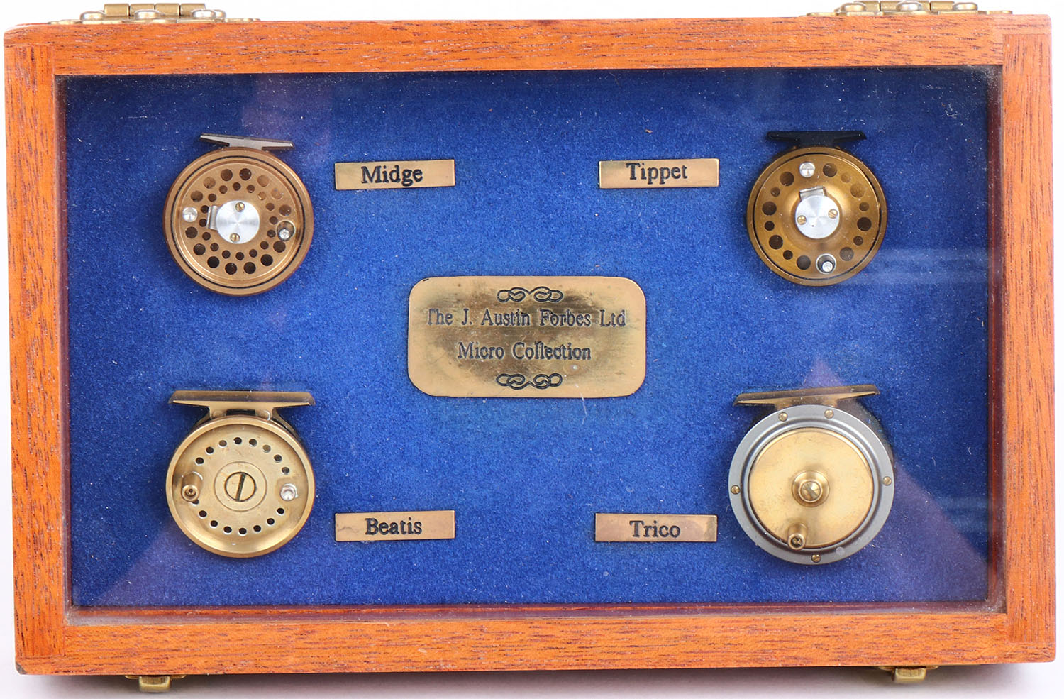 The J. Austin Forbs LTD Micro Collection in wood shadow box, Midge, Trppet, Beatis & Trico, all for brass miniature reels are functioning, his would be a great office desk display, 8'' x 5'' x 1''. Grade: MINT - Value: 100 to 500