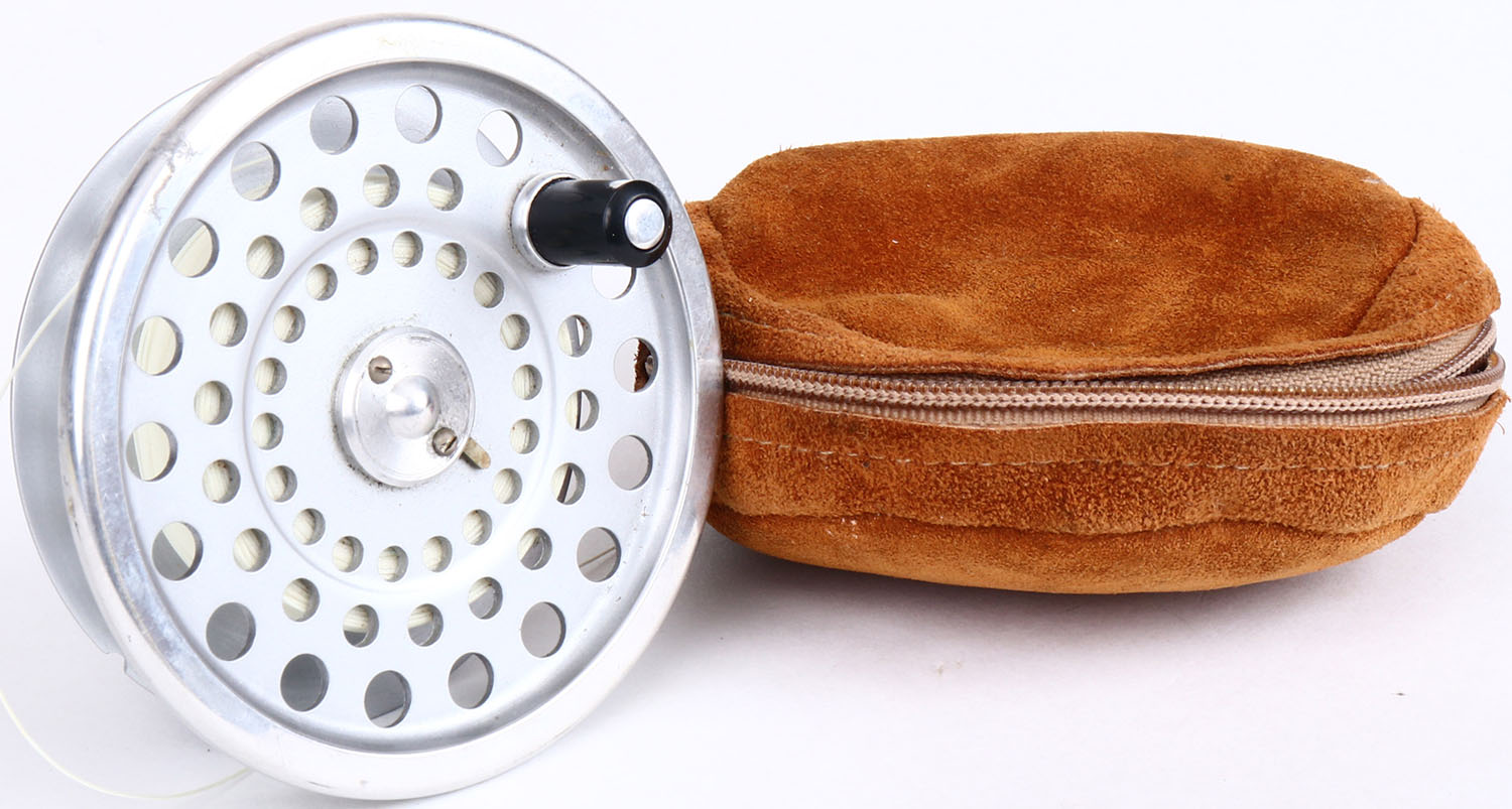Hardy Bros. Fly Reel Spool, shows some wear, 3 1/2'' dia., has leather pouch. Grade: Very Good ++ - Value: 10 to 50