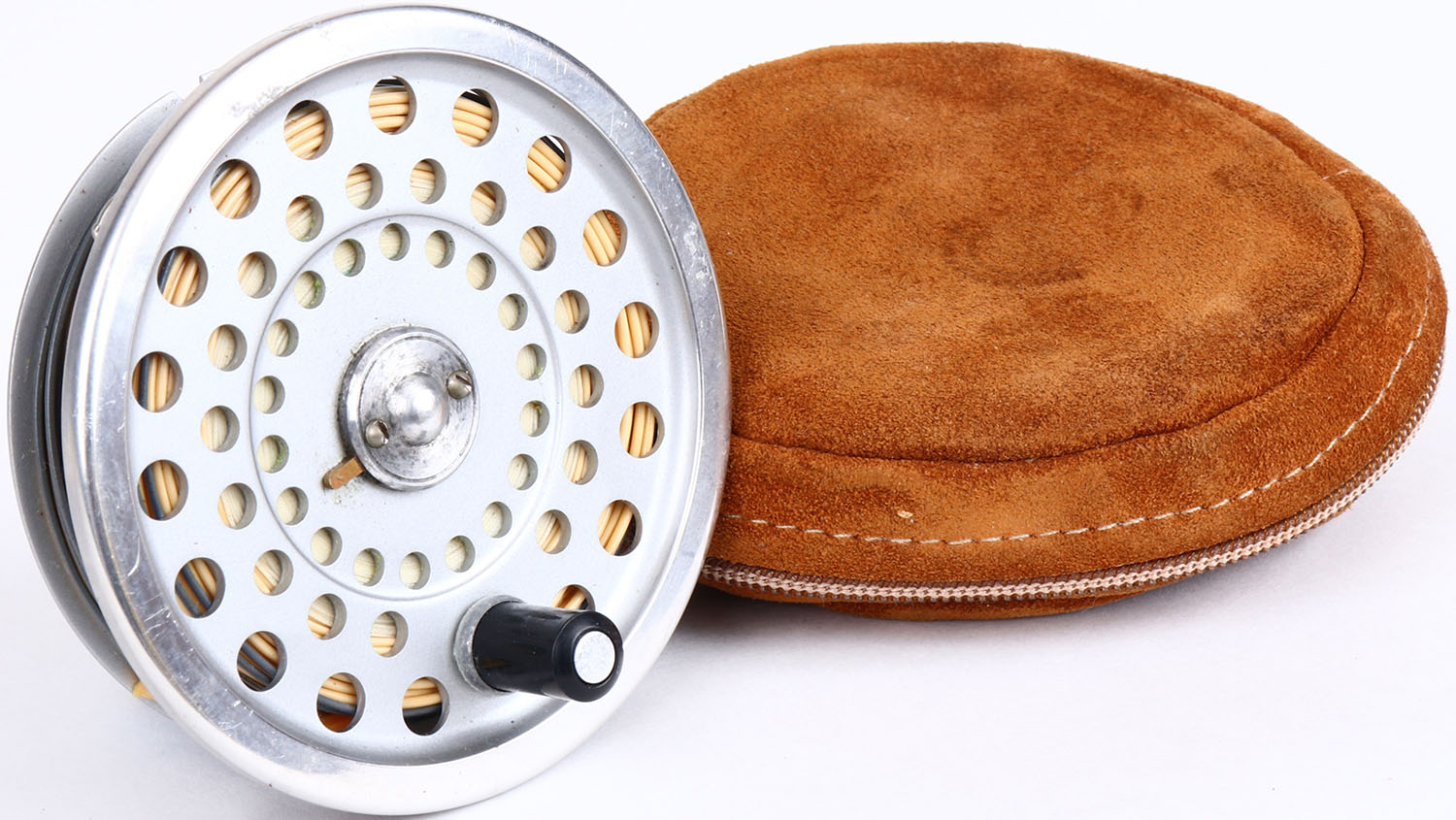 Unmarked Fly Reel Spool, shows light wear, 3 1/2'' dia., has leather pouch. Grade: Excellent - Value: 10 to 50