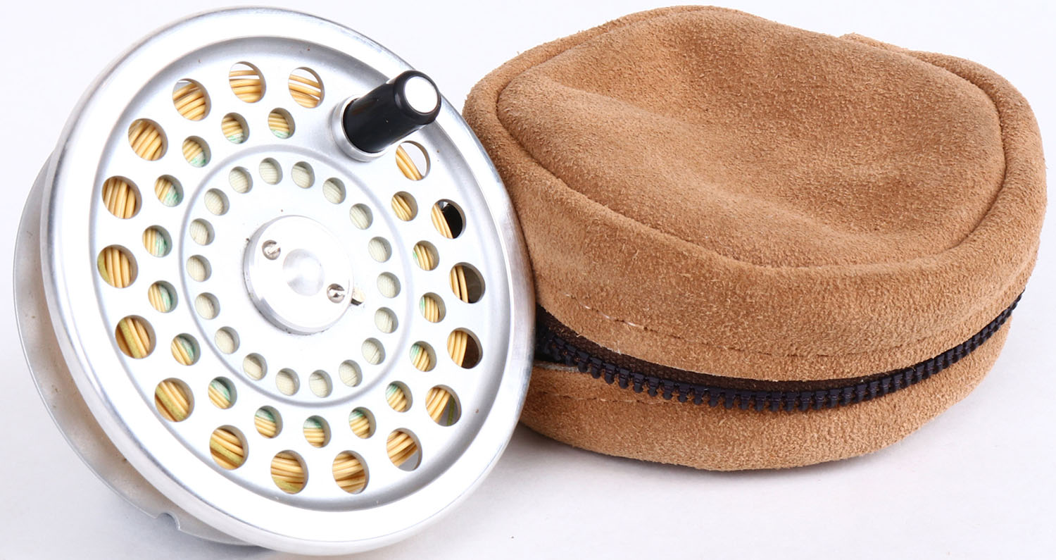 Hardy Bros Fly Reel Spool, shows light wear, 3 1/4'' dia., has leather pouch. Grade: Excellent - Value: 10 to 50