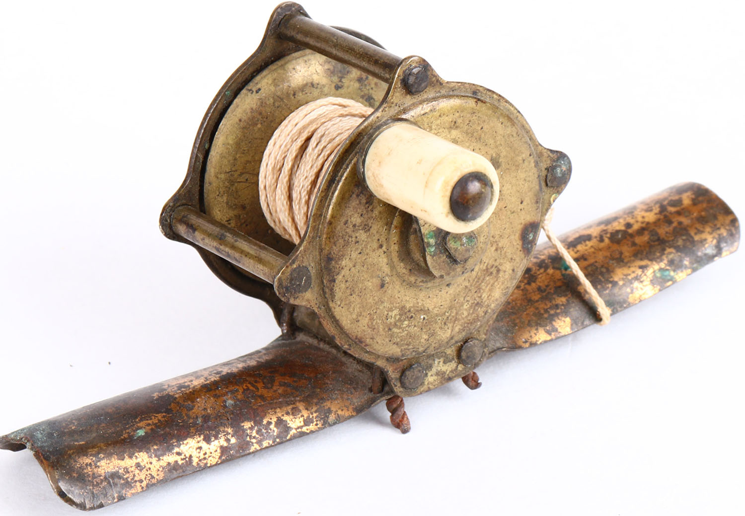 Unmarked small brass fly reel circa 1860s, single white handle, works well. Grade: Excellent - Value: 10 to 50