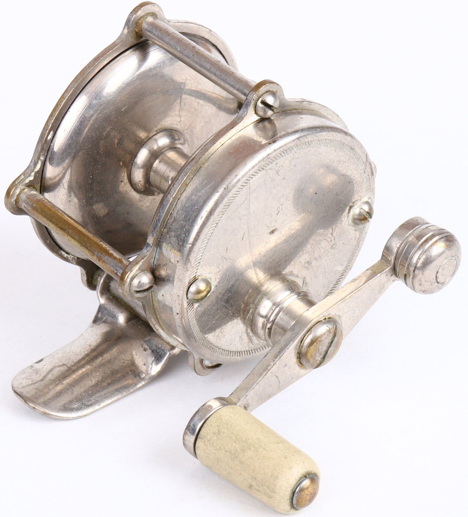 | Unmarked small silver fly reel, circa 1910, single white handle...
