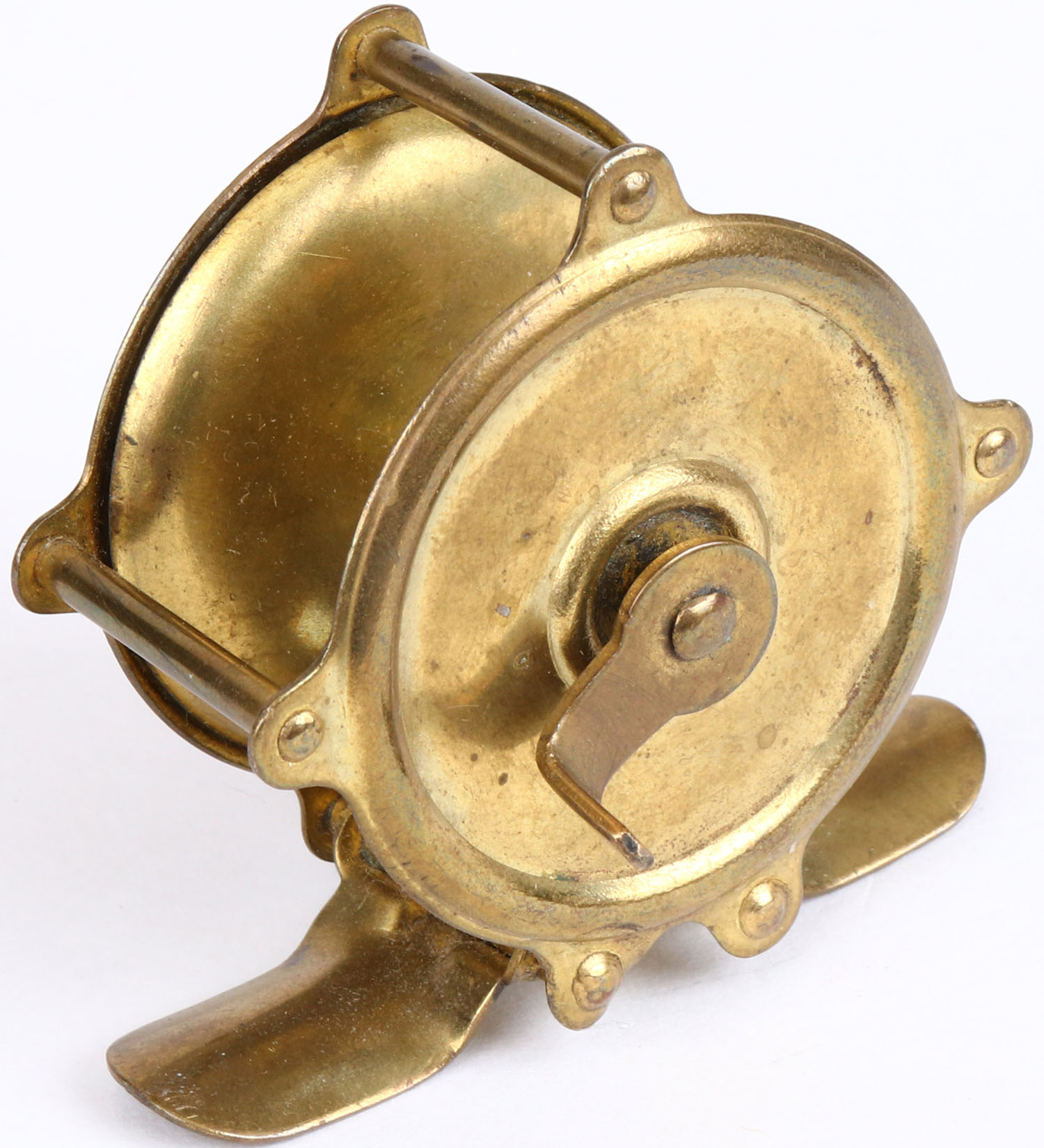 | Unmarked small brass fly reel, circa 1910, wood handle, is missi...