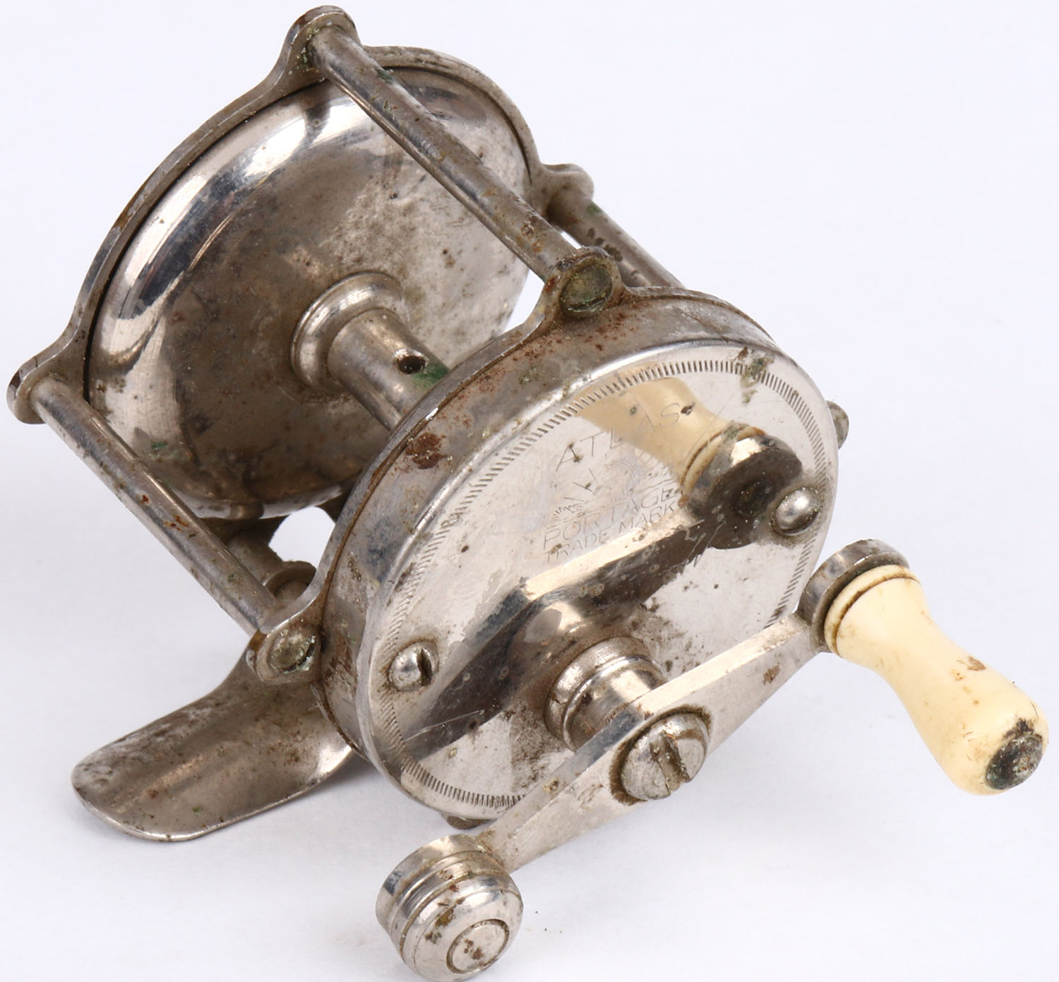 Atlas Portage silver reel, single white handle, strong click, needs some TLC. Grade: Very Good ++ - Value: 2 to 30