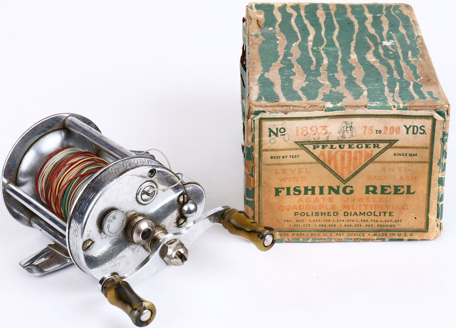 Pflueger Akron 1893 level wind reel in original box, strong click. Grade: Very Good - Value: 4 to 40