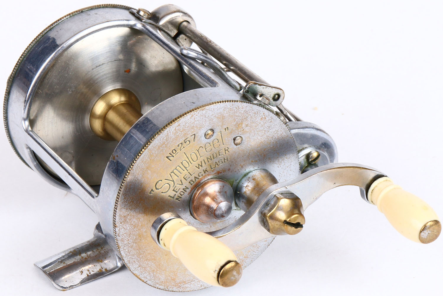M.E. Meisselbach MFG Co. Catucci Symploreel No. 257 level wind reel, dual white handle, strong click, & spins great. Grade: Excellent + - Value: 30 to 100