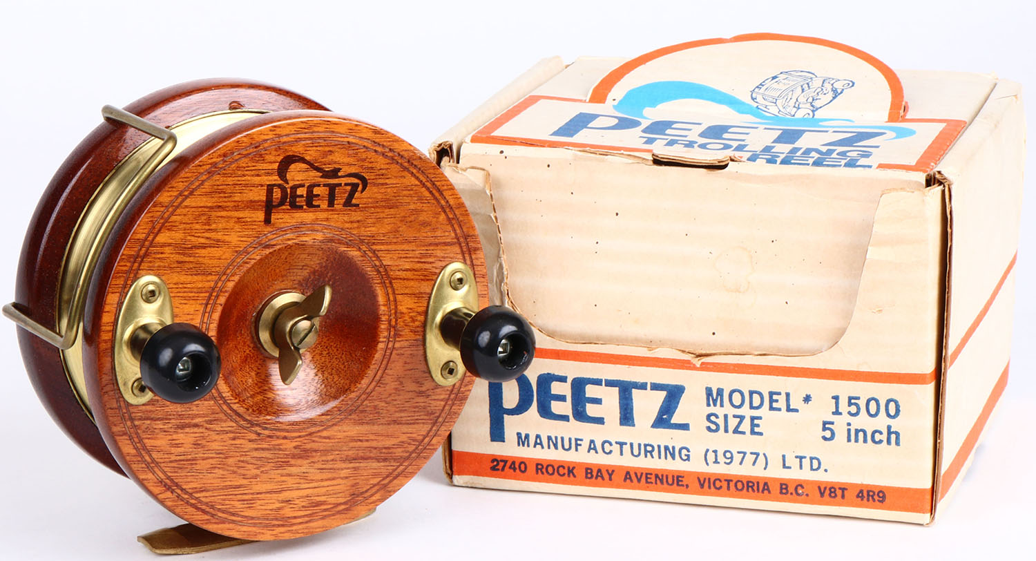 Peetz wood reel in the original box, Model 1500, 5 inch dia., looks great with one very small ding. Grade: Excellent + - Value: 20 to 100
