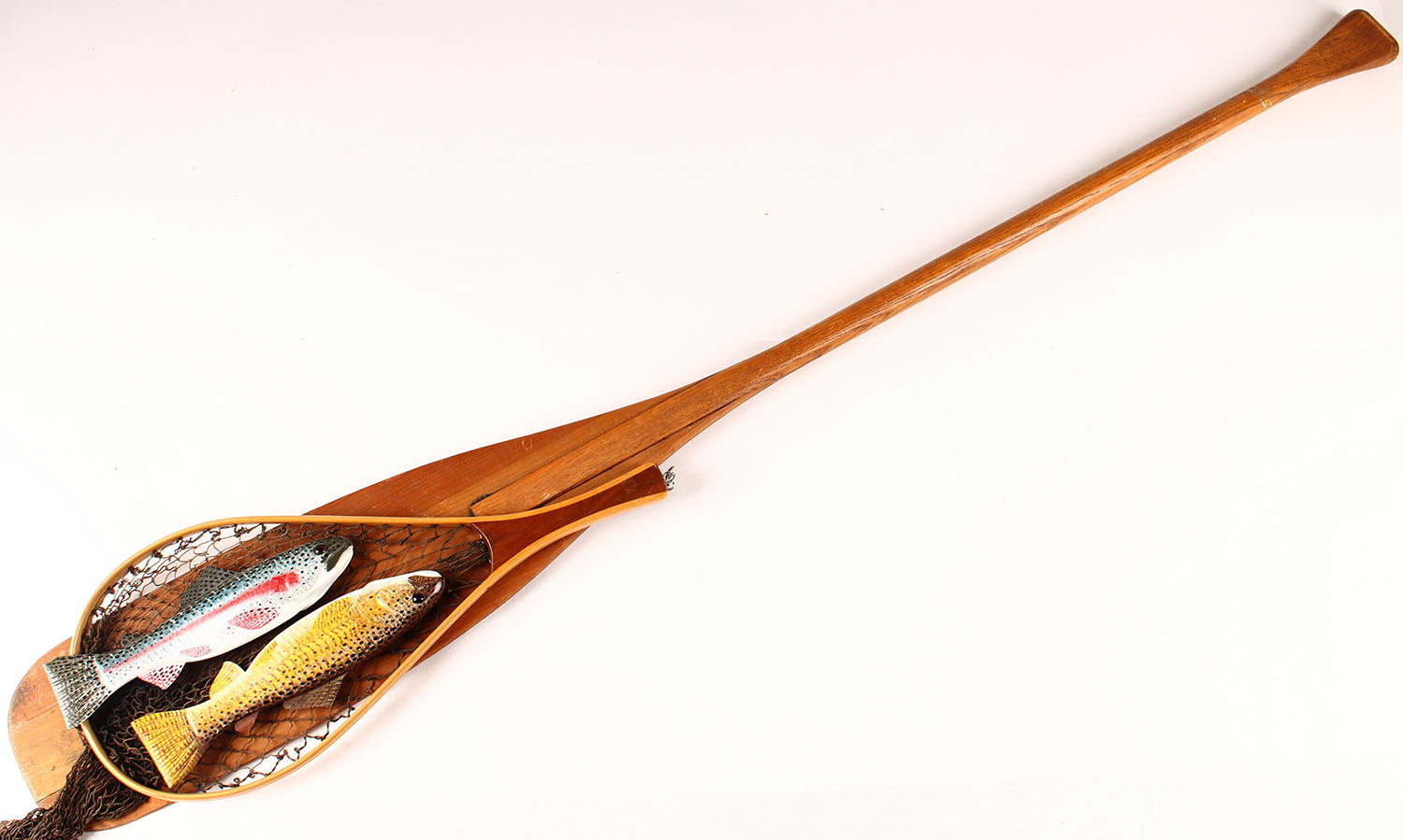 Carl Christiansen hand carved trout with net & oar that is signed, very nice display, 59'' long. Grade: Excellent - Value: 70 to 450