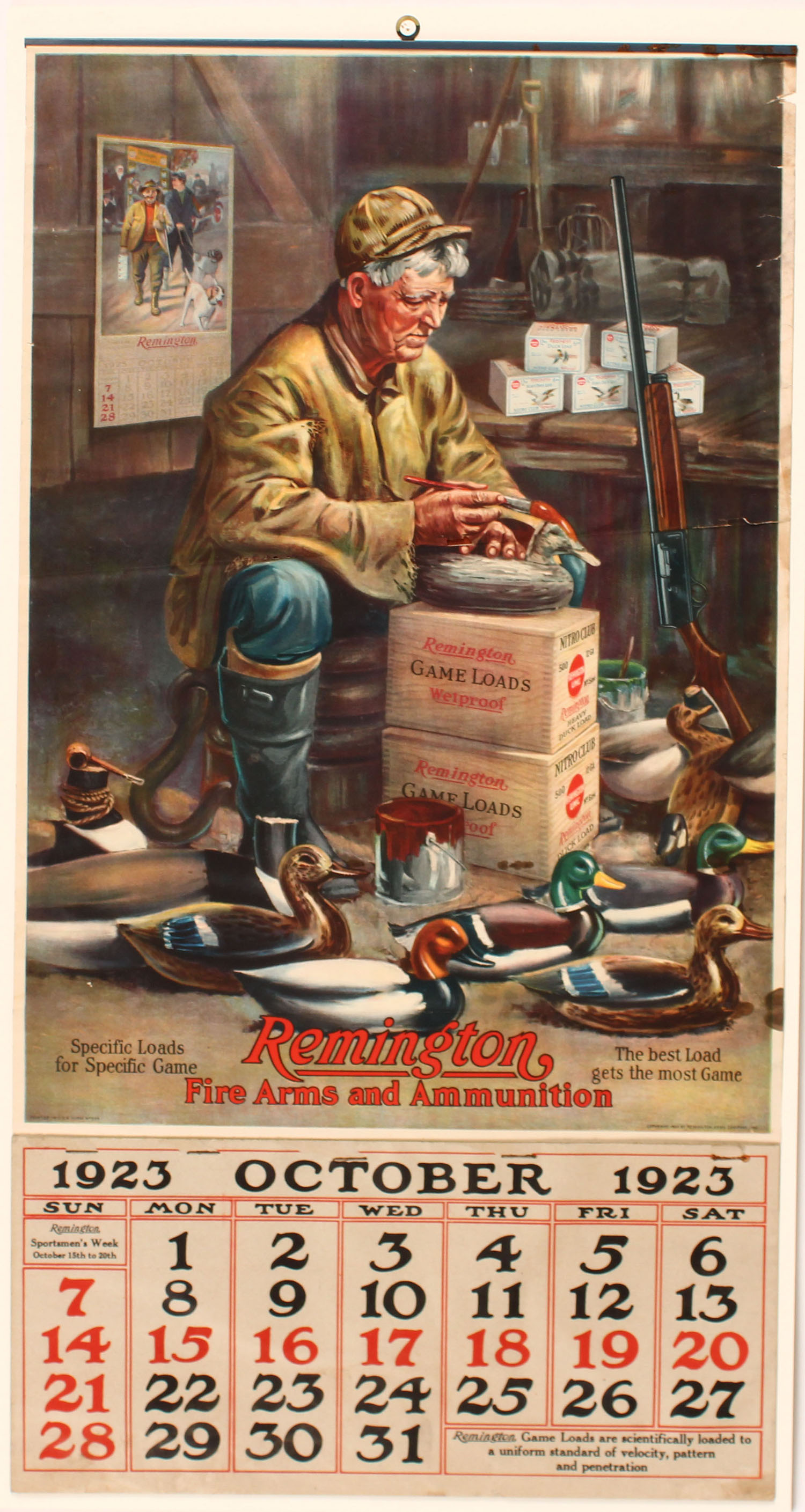 1923 Remington Fire Arms and Ammunition Cart. Co. Game Load Calendar, pictures hunter in cabin painting decoys with many 2pc shotshell boxes in background, 15'' x 28'', shows some edge wear and two roll wrinkles otherwise very nice, Oct-Dec pages, nice vivid colors. Grade: Excellent - Value: 2000 to 4000