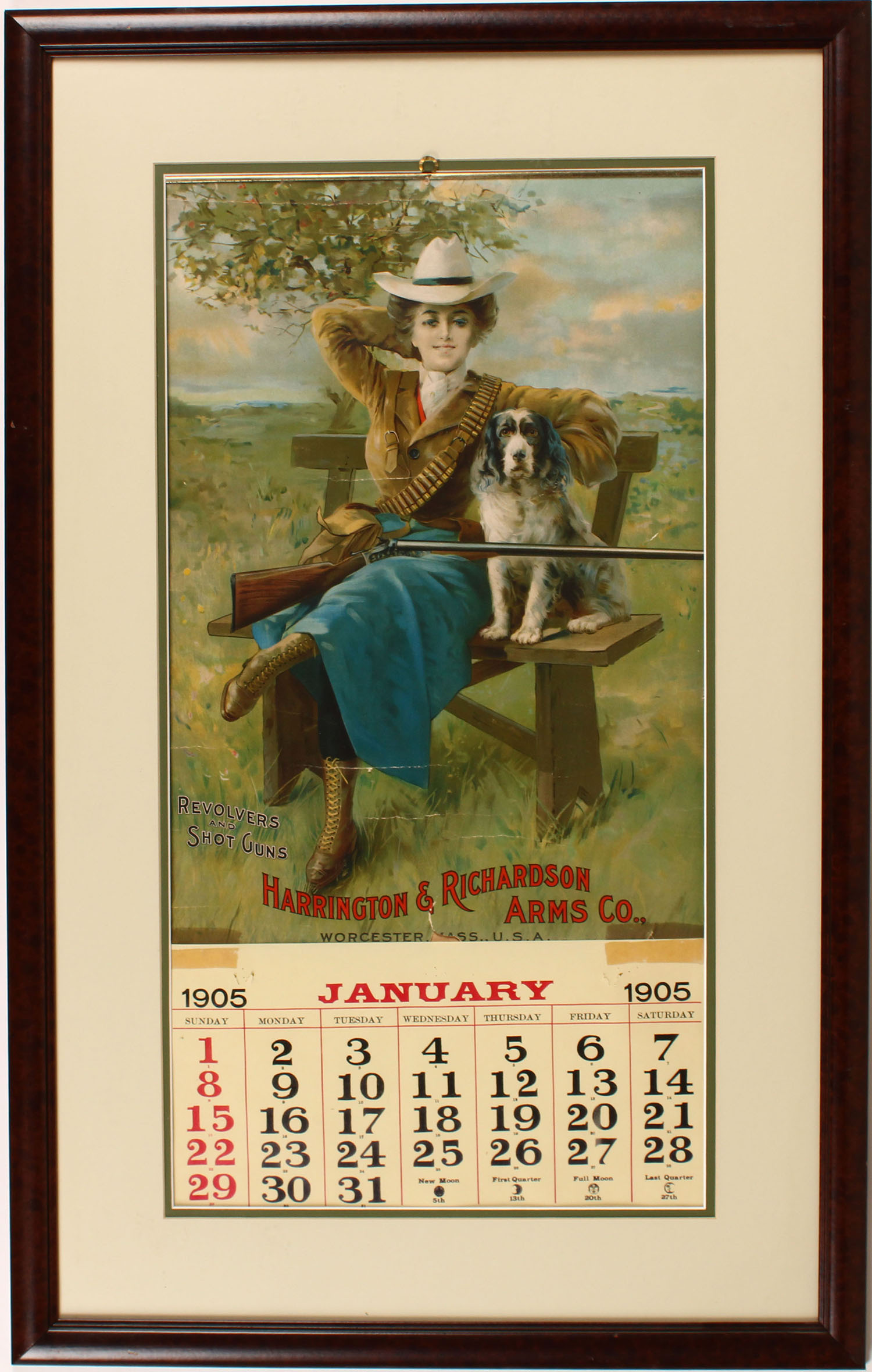 Extremely Rare 1905 Harrington & Richardson Arms Co. Calendar, wonderful full color image of lady in dress with hunting dog on bench with double shotgun, Jan. Page, has metal band on top with brass hanger, has a few light wrinkles & a tear to bottom middle, calendar page has come loose & brought in front of calendar when framed, has great colors & 100% original 14'' x 26'', framed and matted so you can see the band, Very Rare & first time we have offered this one! Grade: Very Good ++ - Value: 1000 to 3000