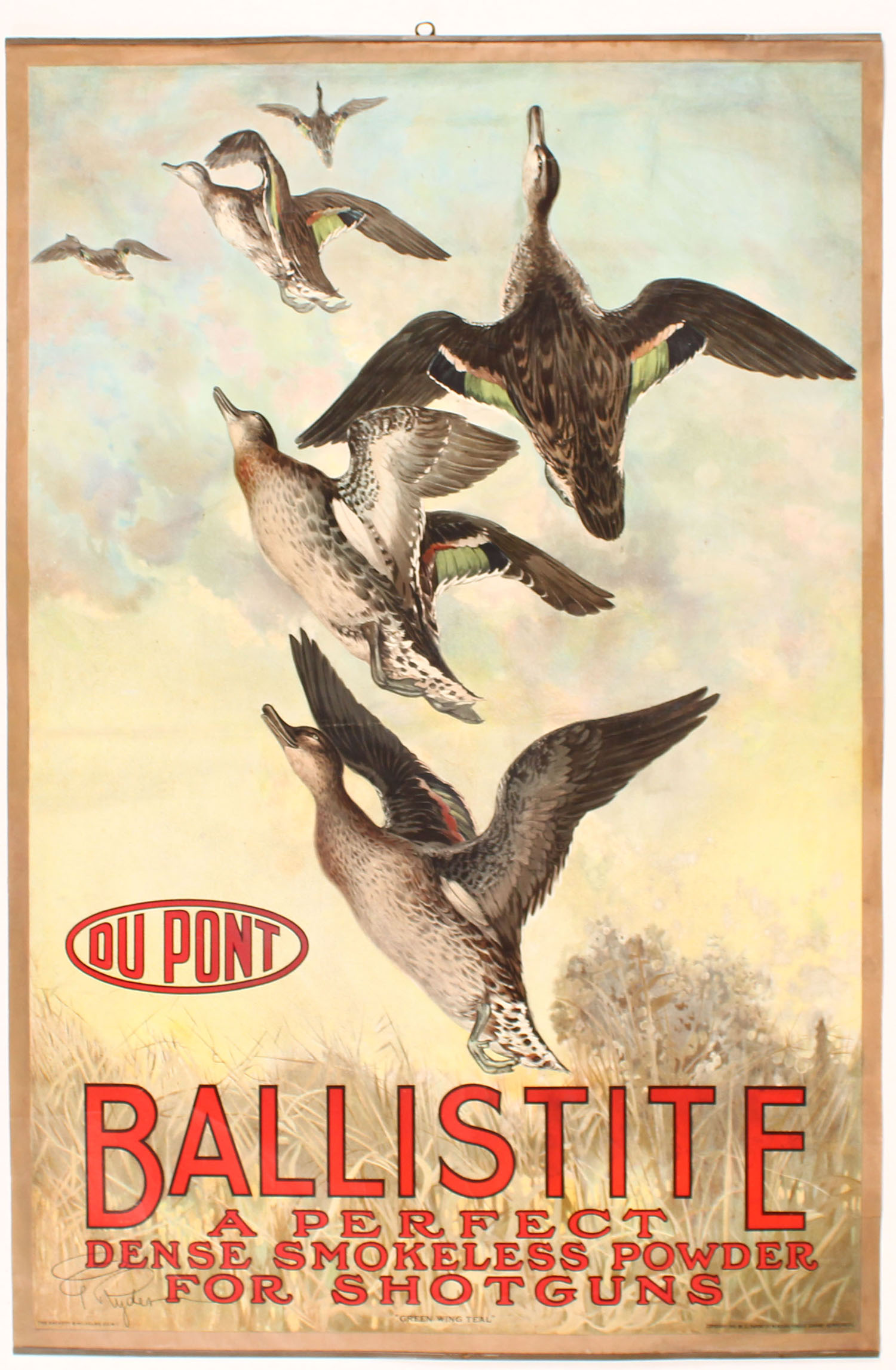 RARE DUPONT BALLISTITE Poster pictures Green-wing Teal in flight, dated 1913, has meatal bands top & bottom with brass hanger, has been professional touched up in some places, wonderful full color image with teal up close & flying straight up, 20'' x 30 1/4'', Rare & hard to find! Grade: Excellent - Value: 2000 to 4000