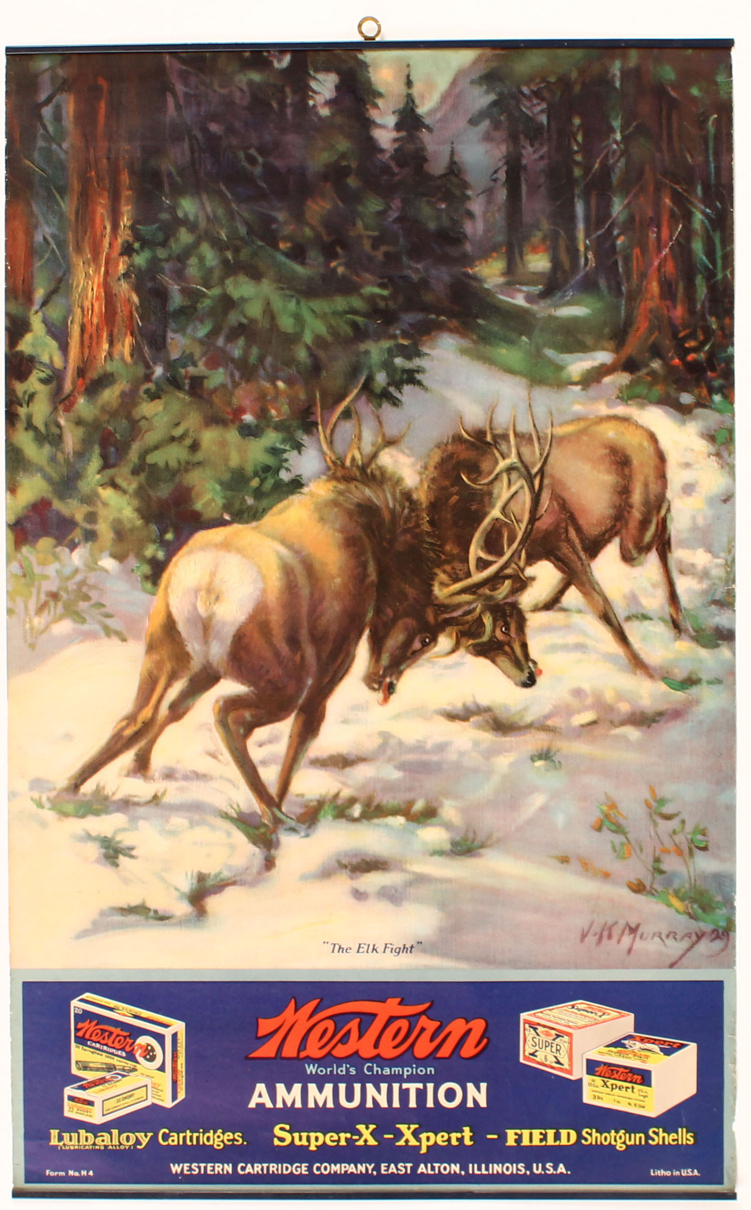 WESTERN AMMUNITION POSTER!, ''THE ELK FIGHT'' by V.K. Murray, absolutely beautiful image of two bull elk fighting in snow scene, 15'' X 24'', has metal bands top & bottom with brass hanger, fantastic colors & near mint. Grade: Excellent ++ - Value: 800 to 2500