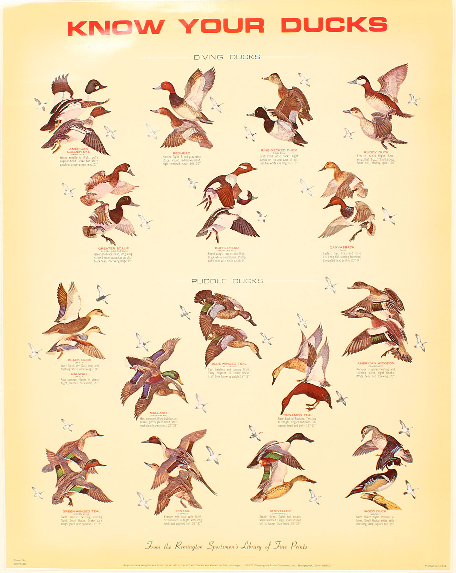 Remington KNOW YOUR DUCKS Poster, pictures a full color image of many duck found in the USA, has metal band top and bottom with brass hanger, in the original mailing tube, mint condition, 23'' x 29''. Grade: MINT - Value: 100 to 300
