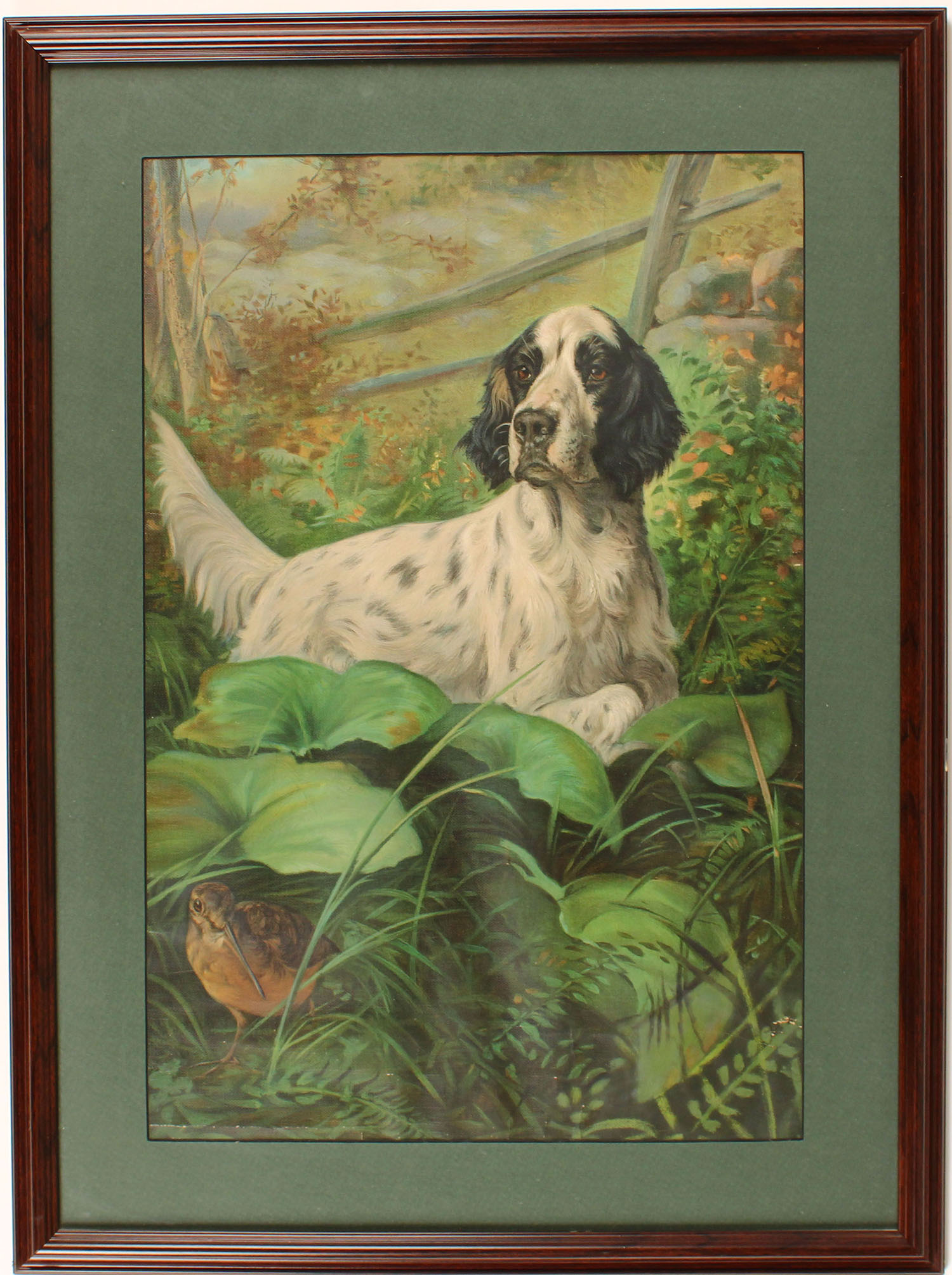 Poster with English Setter & Woodcock in upland setting, has wonderful full colors, 16'' x 24'', we don't believe it has bands, framed & matted. Grade: Excellent - Value: 100 to 500