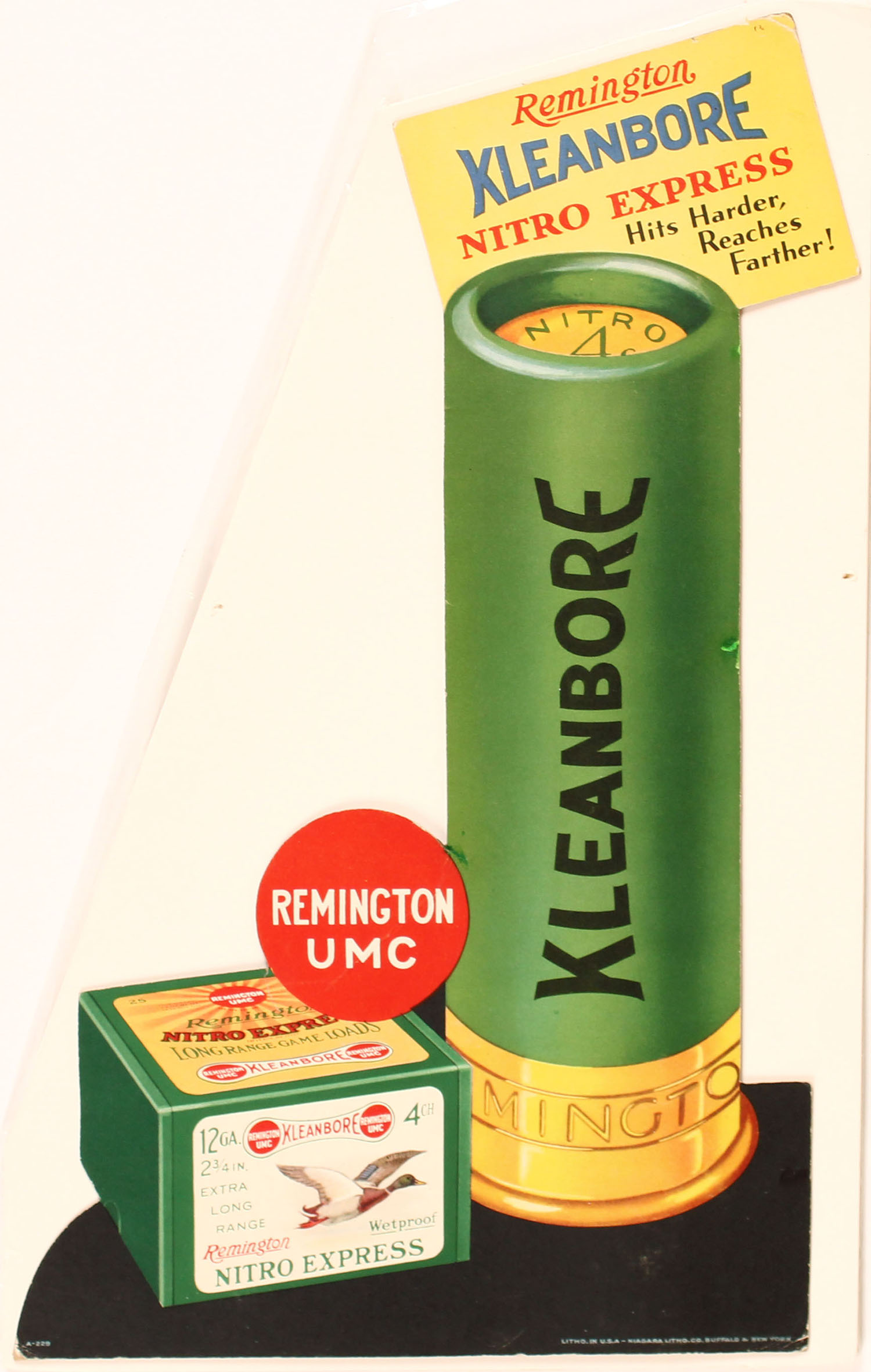 Remington Nitro Express Hits Harder, Reaches Farther!, Kleanbore Diecut of 2pc shotshell box & large green shotshell, has easel back, has great colors, near mint, 11 1/2'' x 18''.* Grade: Excellent + - Value: 700 to 2000