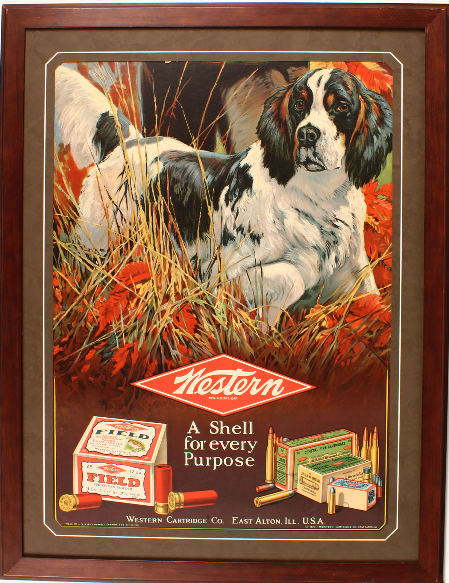 1925 Western Cartridge Co., Cardboard Diecut, Center piece for store window display, ''A shell for every purpose.'', Very slight crease bottom left corner otherwise near mint, framed, has great full color image of dog on point in brush with Western FIELD 2pc shotshell box & many other ammo boxes with shells, 22'' 1/2'' x 30 1/2''. Very Rare & first time we have seen this one! Grade: Excellent ++ - Value: 1500 to 3000