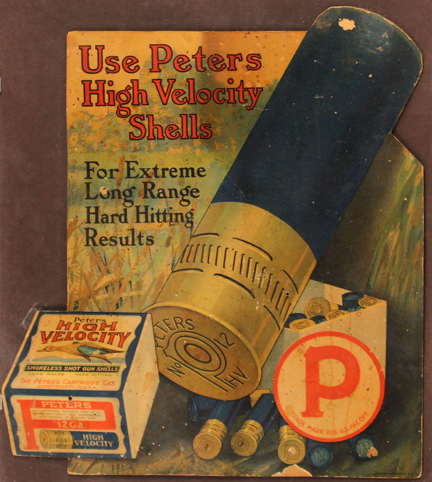 Peters Diecut ''USE PETERS HIGH VELOCITY SHELLS'', pictures 2pc blue-wing teal box & large blue shot shell, shows age soiling & edge wear, 13 3/4'' x 15''. Grade: Very Good - Value: 100 to 500