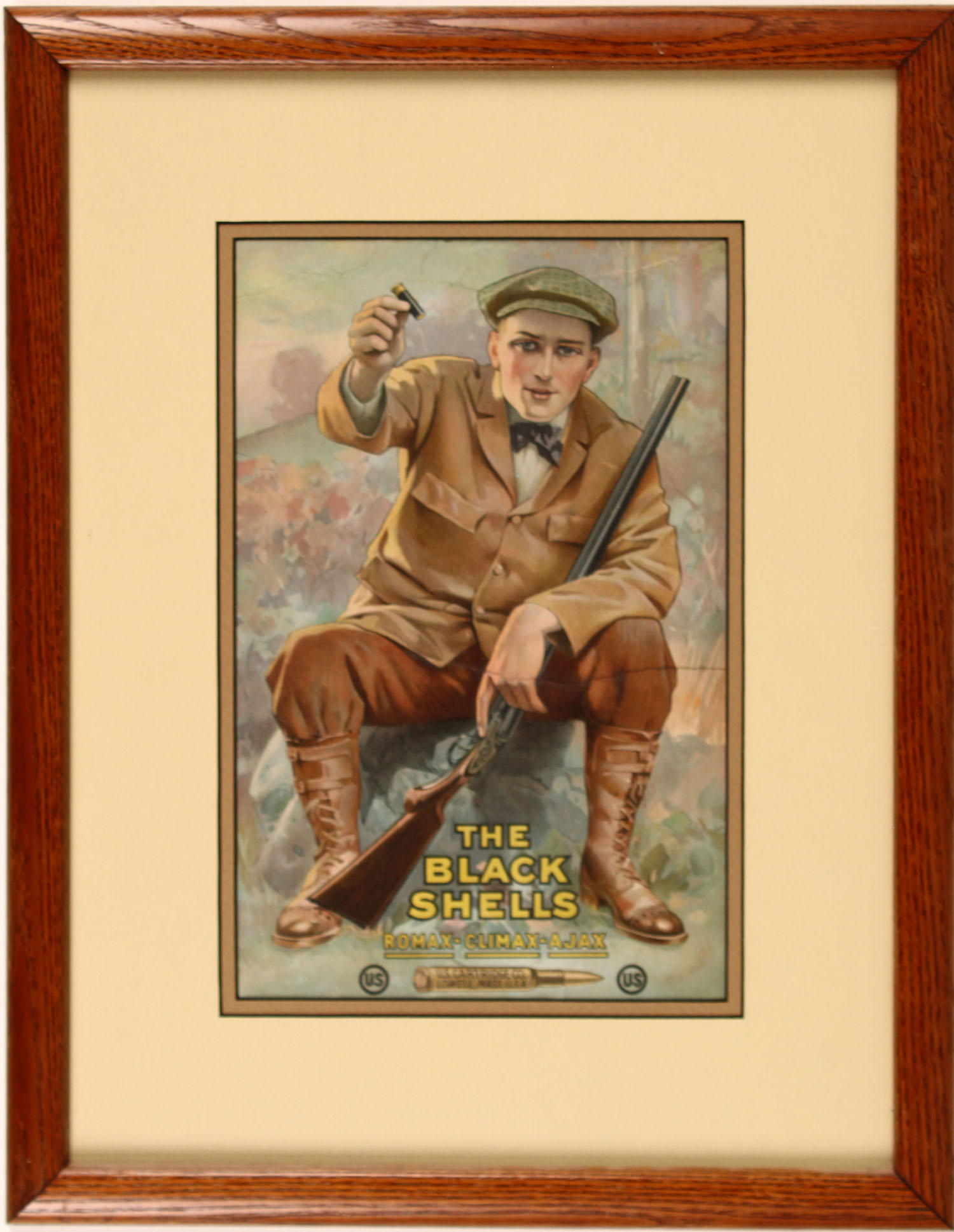 US Cart. Co. Diecut, pictures hunter holding a side by side shotgun & the Black shell, has great colors with minor tears, 8 1/4'' x 12'', framed & matted. Grade: Excellent - Value: 100 to 600