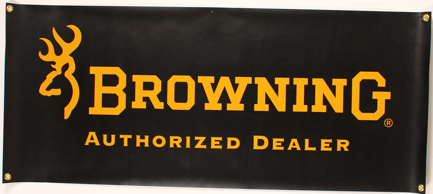 Browning Authorized Dealer Banner, black & gold, 43'' x 80''. Grade: MINT - Value: 20 to 100