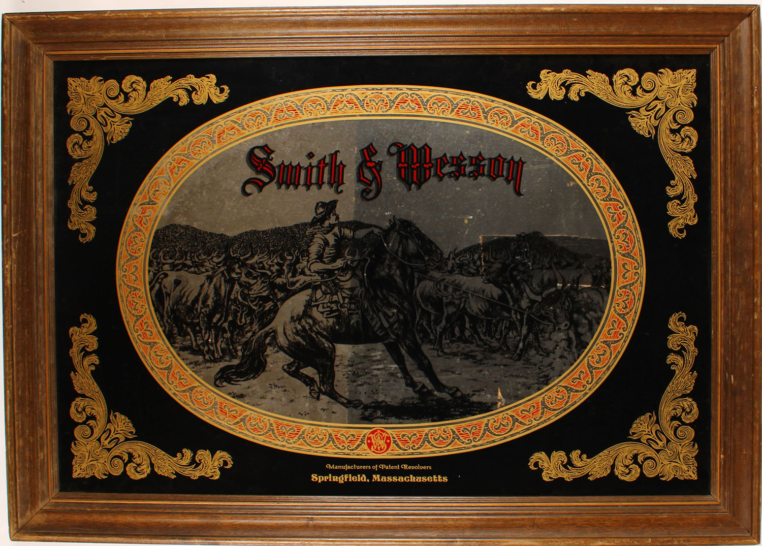 Smith & Wesson Mirror advertisement, black, gold & red, framed, 41'' x 29''. Grade: Excellent - Value: 100 to 2000