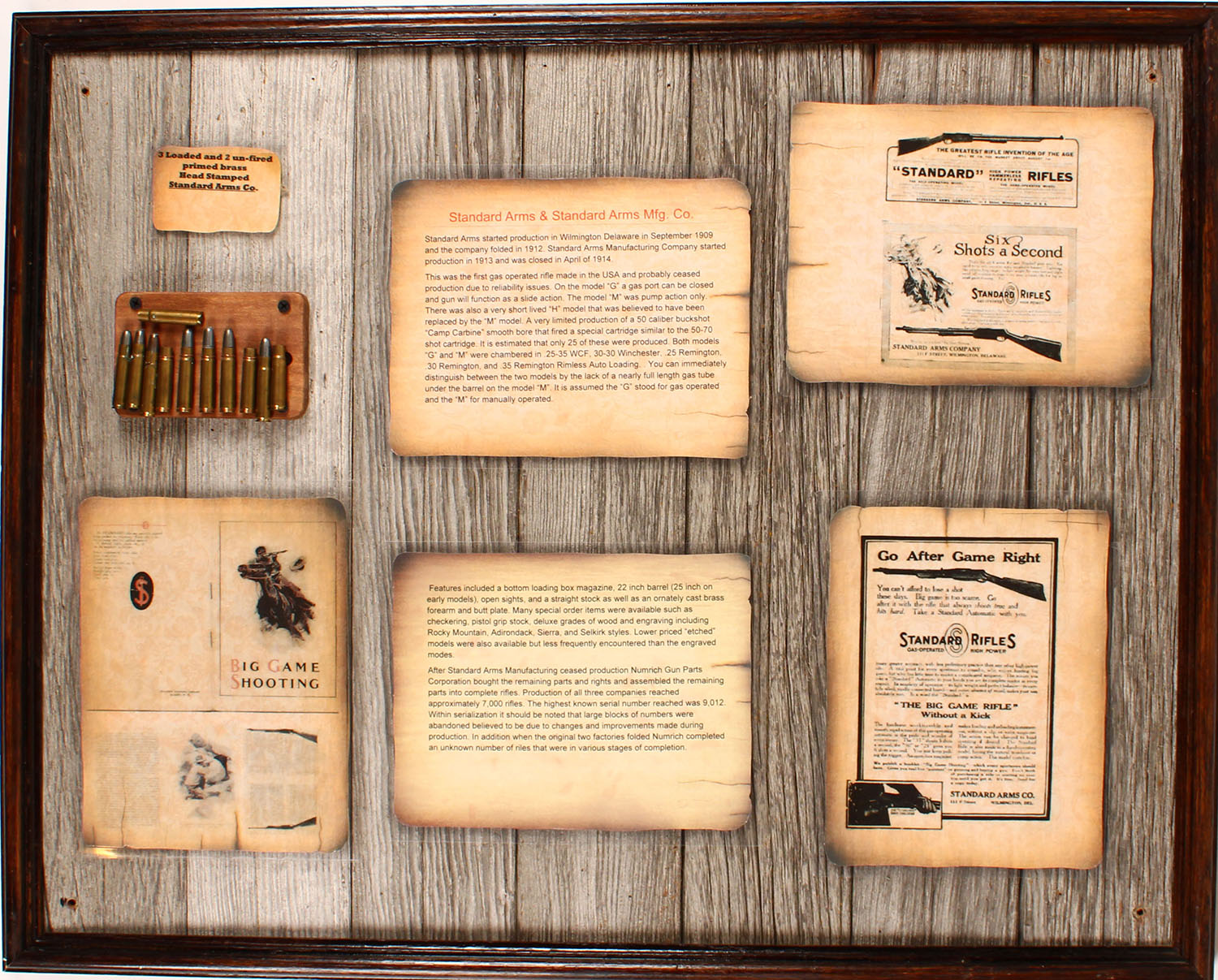 Standard Arms & Standard Arms MFG Co. Display that includes 7 cartridges with the correct H/S, has history of the company along with the 7 cartridges. Look at Lots 4??? & 4??? for two of the 4 Standard rifles we are offering in this sale. One is the RARE CAMP RIFLE 50 Cal buckshot smooth bore rifle, 37'' x 29'' - Value: 50 to 500