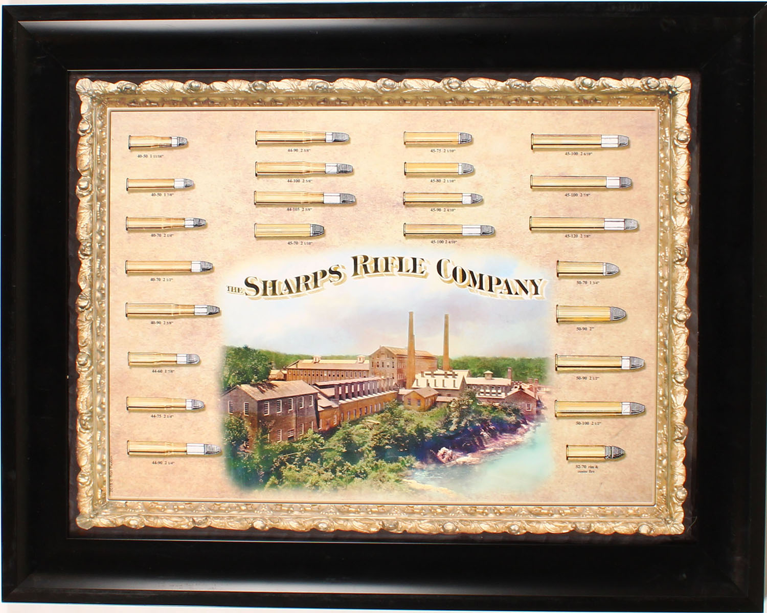 Sharps Rifle Co Poster, has beautiful colors of factory on rivers edge & many cartridges, 23'' x 17'', framed. Grade: Excellent - Value: 100 to 300