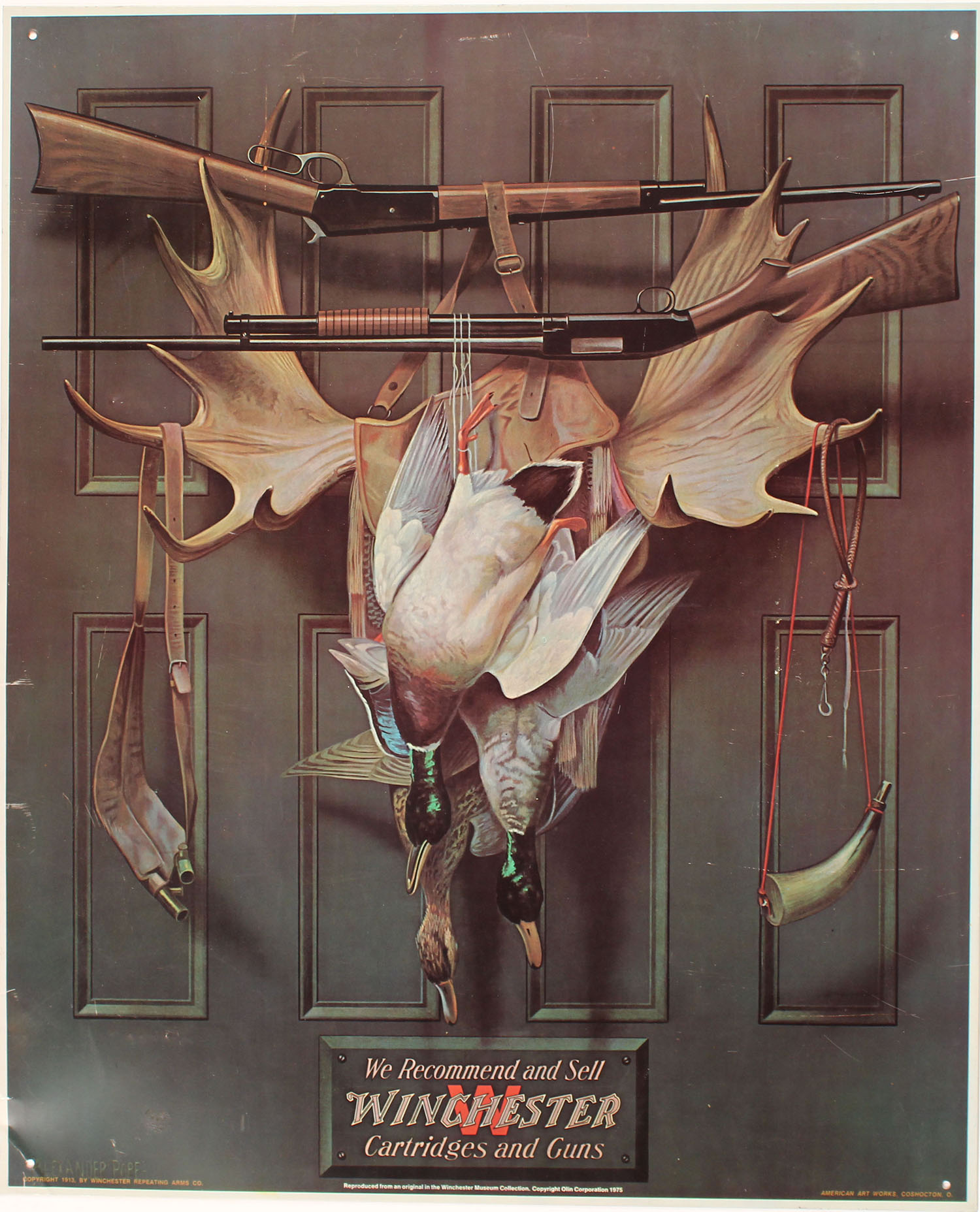 Winchester The Green Door tin sign, this is the authorized reproduction issued in 1975, 22'' x 27'', pictures mallards hanging from guns that are on moose horns mounted to a green door. Grade: Excellent - Value: 40 to 200