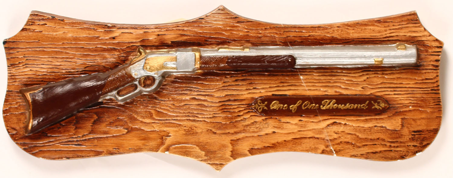 One of One Thousand Winchester Rifle 3D on plaster board, has repaired crack, 22'' x 8''. Grade: Very Good - Value: 2 to 100