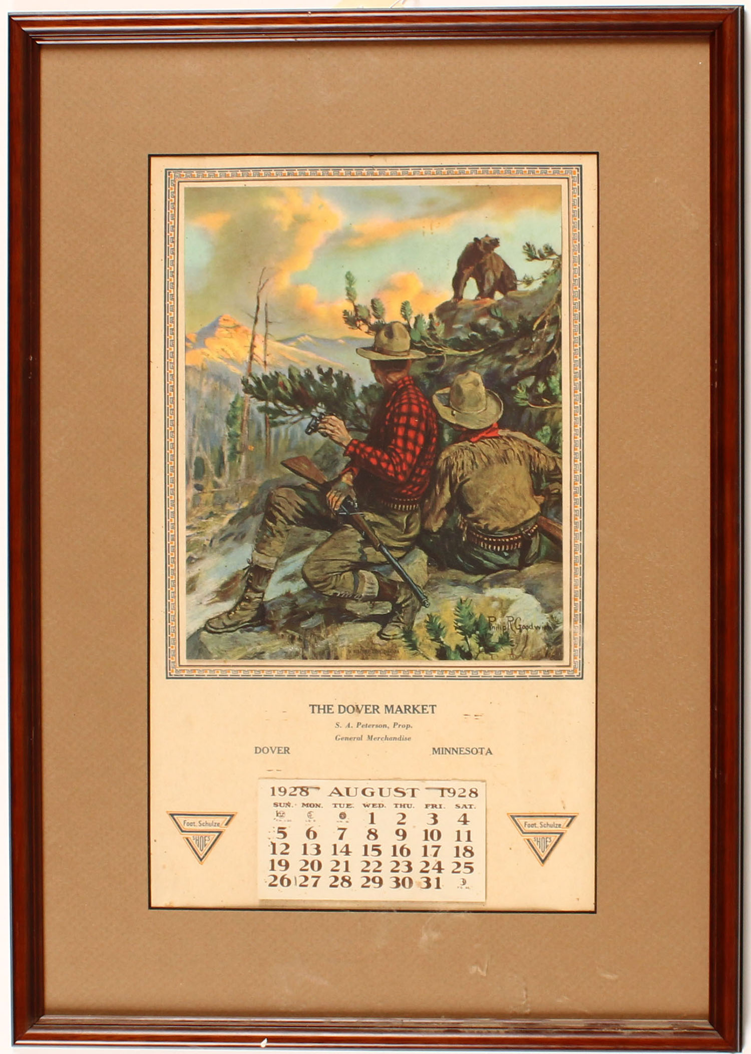 1928 Philip R. Goodwin Calendar ''A TIMBER LINE DRAMA'', pictures two hunters looking for big game when a Grizzley bear shows up behind them, Aug. - Dec. pages, 10'' x 16 1/2'', framed & matted. Grade: Excellent - Value: 50 to 200