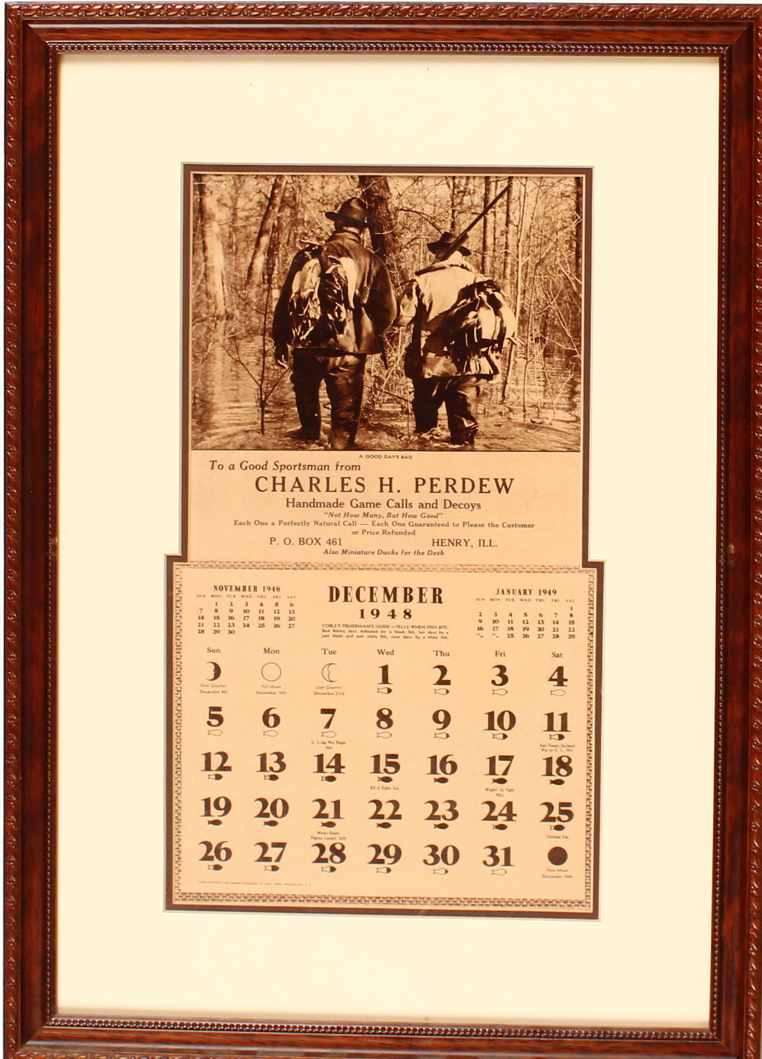1948 CHARLES H. PERDEW Calendar, pictures two duck hunters leaving flooded timer with a limit of mallards, dec. page, Perdew is famous of hand made calls & decoys, 9'' x 16'', framed & matted. Grade: Excellent - Value: 30 to 200